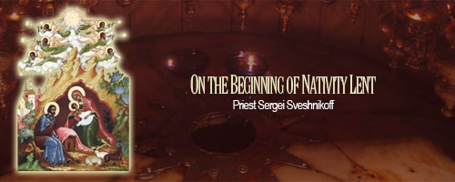 e have begun the joyful and holy Nativity Lent. It begins on November 28, forty days before the Incarnation of our Lord and Savior Jesus Christ, and ends on the feast day of the Nativity on January 7, according to the civil calendar. Just as the Jewish people had wandered for the desert for 40 years before reaching the Promised Land, so does the Holy Church lead us through a forty-day Lenten wilderness before we enter into the promise of God, revealing the Nativity to us. For the Jews, roaming the desert was necessary in order to throw off the chains of slavery�physical, mental and spiritual chains. An entire generation of people which had been born and reared in slavery had to die, before those who already had no memory of enslavement, or were born free, could be permitted to enter into �a good land and a large, unto a land flowing with milk and honey� (Exodus 3:8). We, too, must throw off the chains of enslavement by sins and passions�physical, mental and spiritual slavery. We must cease to be servants of sin and become friends of Christ through the fulfillment of His testament (John 15:14).