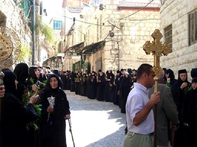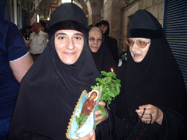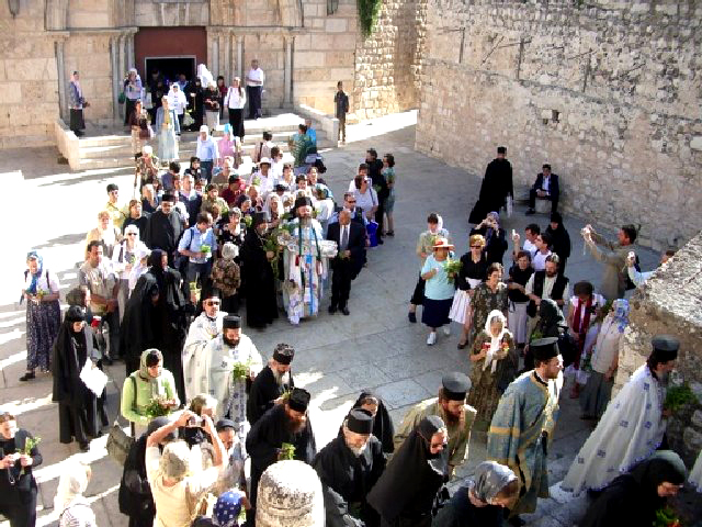 Праздник Успения Божией Матери называется Богородичной Пасхой и весьма торжественно отмечается на Святой Земле. За три дня до Успения совершается крестный ход из Малой Гефсимании через весь Старый город к Гробнице Пресвятой Богородицы. Эта традиция пришла к нам из Предания о том, что за три дня до блаженной кончины Пресвятая Дева была возвещена о сем святым Архангелом Гавриилом. Небесный вестник вручил Ей райскую пальмовую ветвь, которую во время похоронной процессии нес святой апостол Иоанн Богослов перед гробом Пресвятой Богородицы. Все апостолы чудесным образом были собраны силою Божиею к одру Пресвятой Девы. Получив последнее земное благословение и попрощавшись с Ней, они исполнили завещание похоронить Ее в Гефсимании у гробницы родителей святых Иоакима и Анны.