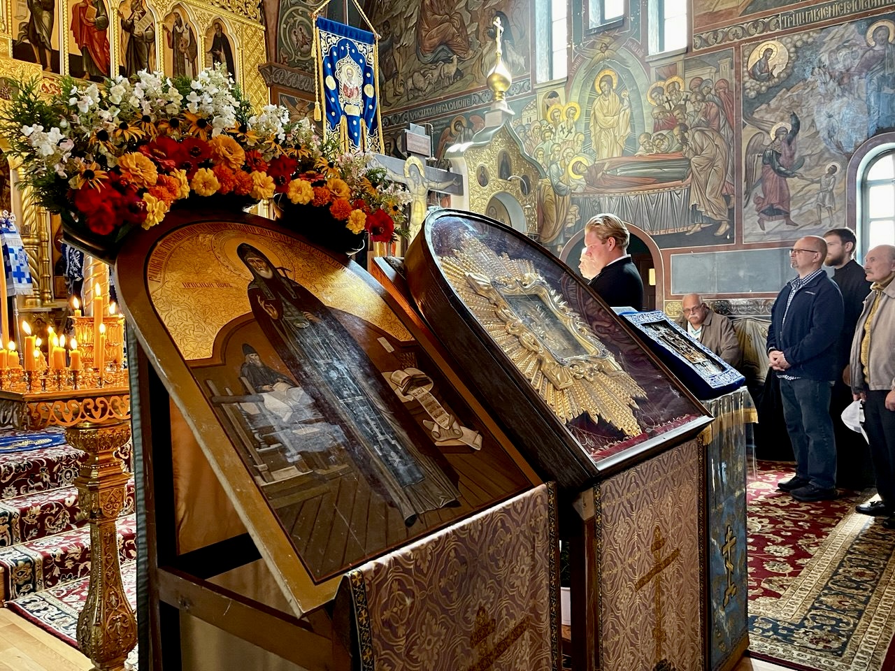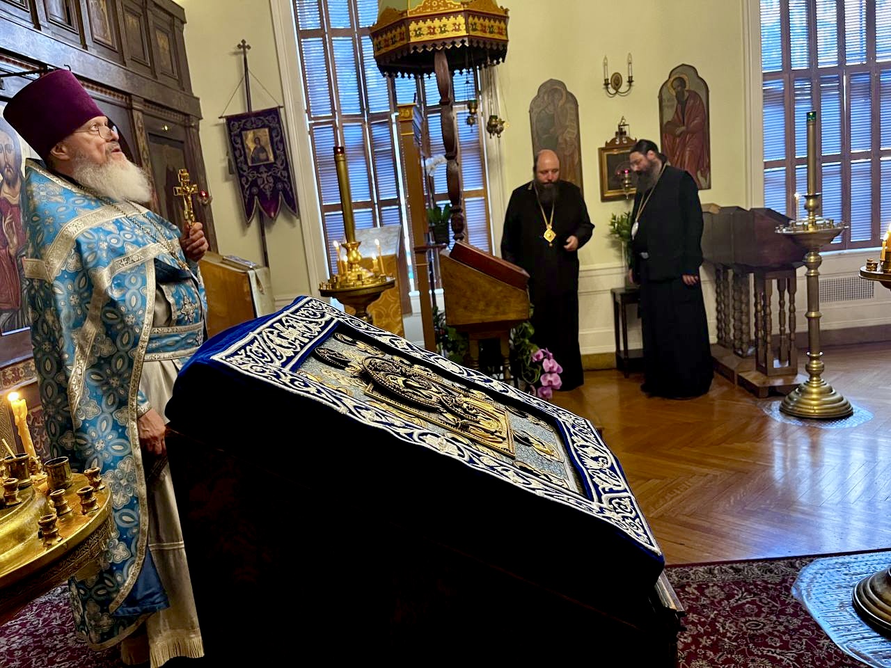 On Friday, August 29, 2025, the feast of the Translation of the Savior Not Made by Hands from Edessa to Constantinople, His Grace Bishop Job of Stuttgart, Vicar of the German Diocese of the Russian Orthodox Church Outside of Russia, arrived in New York accompanying the Kursk-Root Icon of the Mother of God “of the Sign.” The miraculous image was greeted at the Synodal residence by His Eminence Metropolitan Nicholas of Eastern America and New York, First Hierarch of the Russian Church Abroad. After venerating the Shroud of the Mother of God and other relics of the Cathedral and the lower Chapel of St Sergius, His Grace proceeded to the residence of the First Hierarch, where a fraternal meeting took place. That same evening, a dinner was held in honor of the distinguished guest, attended by both archpastors, staff members of the Chancery of the Archdiocesan Synod, and other guests.