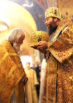 At the minor entrance of the Liturgy, a special moment of recognition befell the Parish Rector, Father Georgy, on the occasion of his 80th birthday. Bishop Irenei having requested of the Holy Synod that the right to wear the mitre be bestowed upon Fr Georgy in honor of his long years of service as well as life, Vladyka conveyed a beautiful mitre — a gift from the parishioners — to the First Hierarch, who laid it upon the head of Fr Georgy with the traditional blessing. With real joy the clergy and faithful cried out "Axios!," warmly celebrating the dignity bestowed upon Fr George who has done so much for the life of the Florentine parish as well as the broader cause of Orthodoxy in Italy.