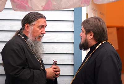 Давид Мозер и священник Сергий Оверт беседуют во время перерыва.