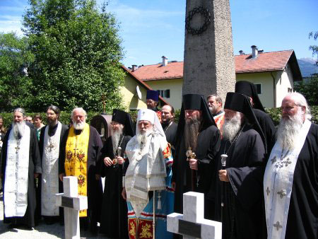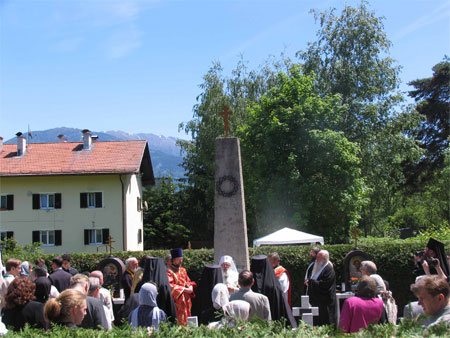 Высокопреосвященнейший Митрополит Лавр с архипастырями и духовенством у памятника казакам в Лиенце.