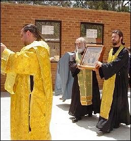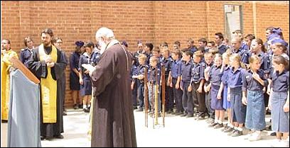 At 11 a.m., under the open sky, on the site of the new chapel being built in honor of St. Seraphim, the singing began marking the beginning of the service. All the children, from the age of 7 up, stood in formation by height in their blue uniforms. Upon the analogion lay the icon of St. Seraphim. A new frame for the icon was prepared by Protodeacon Basil Hadarin of Protection Church in Cabramatta. The spiritual guides of the Vitiazi performed the service of supplication: Protopriest Michael Konstantinoff and Priest George Lapardin, along with the cathedral Deacon Nicholas Triantafillidis. The Vitiaz choir sang under the direction of Andrei Lapteff. After the service and a brief sermon on the life of St. Seraphim given by Fr. Michael Konstantinoff, all the children venerated the icon, accompanied by the singing of the troparion “From his youth did Christ love him…”