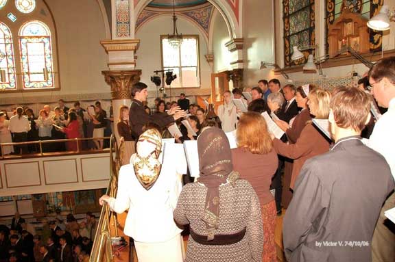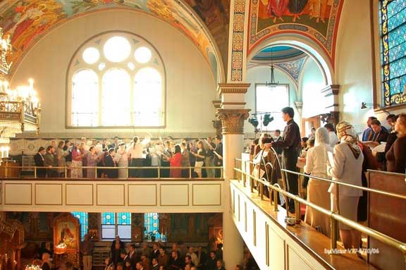 Частично пение на службах было антифонным: пело два хора по пятьдесят певчих каждый, - при том, что кульминацией стало пение всего стоголосого певческого собрания, потрясшее и слух, и сердца всех находящихся в храме. Управляли хором Петр Фекула, Владимир Красовский, Георгий Скок, Олег Мартынов и Михаил Гриц. На отпусте Преосвященный Гавриил обратился со словом, в котором подчеркнул значение подобных съездов для жизни Церкви.
