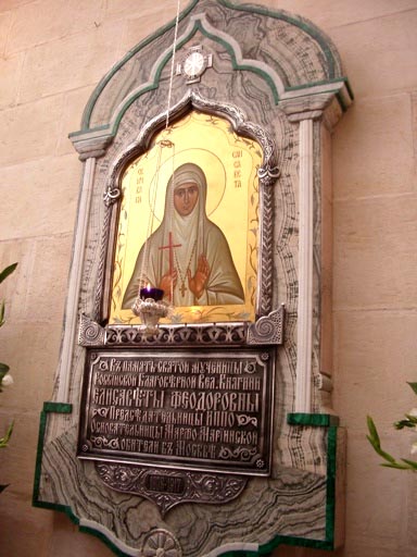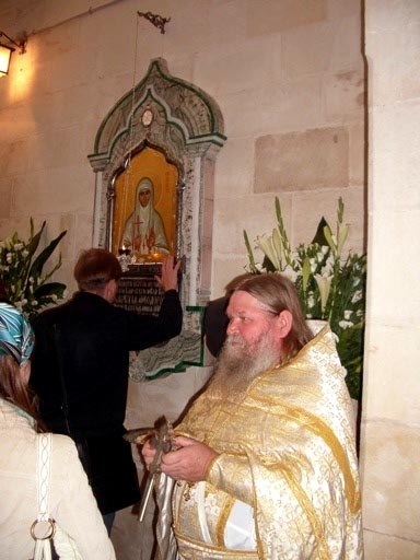 1 ноября в храме Александро-Невском на «Русских Раскопках» было торжественно отмечено 25-детие прославления Новомучеников и Исповедников Российских. В этот день родились два великих русских святых – святой праведный Иоанн Кронштадский и святая преподобномученица Великая Княгиня Елизавета. Так совпало, что именно к этому дню был готов кивот с иконой святой преподобномученицы Елизаветы Фердоровны, которая после трагической смерти своего супруга Великого Князя Сергия Александровича в 1905 г. стала вместо него председателем Императорского Православного Палестинского Общества (ИППО) вплоть до революции 1917 г. Члены ППО давно имели желание сделать достойное приношение Княгине-мученице. И вот нашлась благодетельница родом из Екатеринбурга, старанием которой был сооружен из полудрагоценных уральских камней с серебрянной отделкой кивот, а икона была написана в Иерусалиме. На освящение кивота собралось много гостей. Была совершена Божественная литургия игуменом Андроником (Котляровым), и. о. Начальника Русской Духовной Миссии. Пели сестры из Гефсиманской обители. За литургией молилась группа паломников из России, многие из которых приехали из Екатеринбурга. Среди гостей также был архимандрит Тихон – новый Начальник московской РДМ. После освящения была предложена трапеза в стенах Александровского подворья.