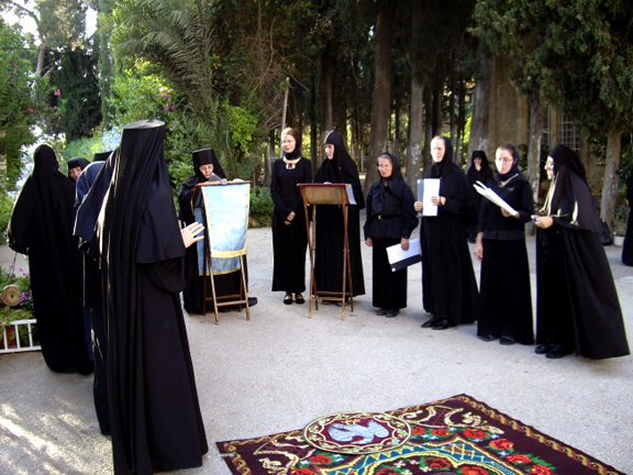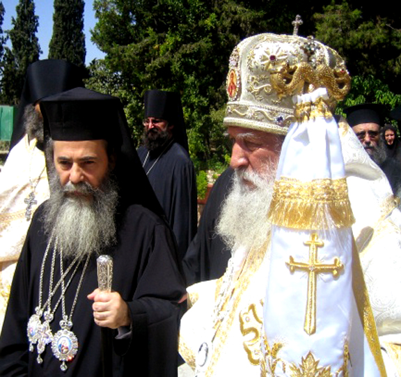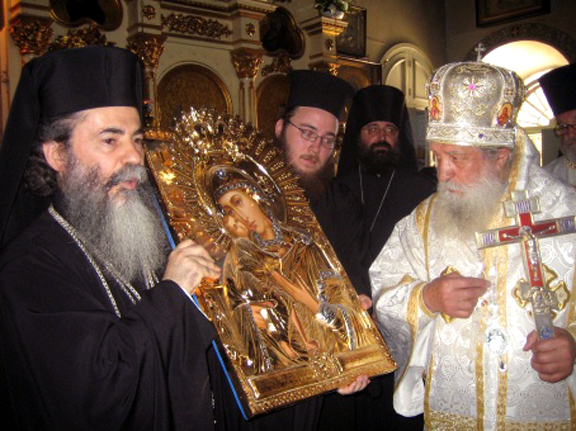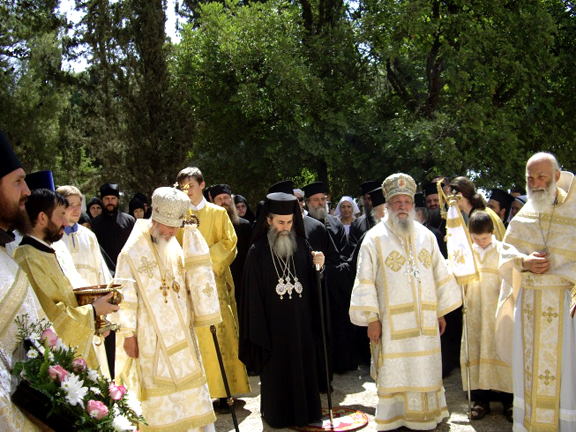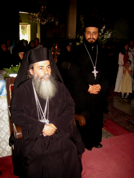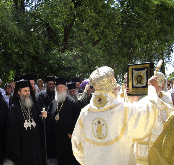 Затем был совершен благодарственный молебен с крестным ходом вокруг церкви, после чего Его Блаженство приветствовал Высокопреосвященнейшего Владыку и обратился к молящимся со следующими словами: "Ваше Высокопреосвященство, Высокопреосвященнейший Владыко! Ваше Преосвященство, дорогие о Господе отцы, братие и сестры! "Днесь благодать Святаго Духа нас собра" для вознесения благодарной молитвы к Богу, сподобившему нас великой Своей милости. Мы рады приветствовать вас в этот торжественный для всех нас день. Во время недавней встречи с Высокопреосвященнейшим Владыкой и членами делегации Русской Зарубежной Церкви мы осведомились о ходе переговорного процесса между обеими частями Русской Православной Церкви. От имени нашего Священного Синода и Свято-Гробского братства хочу выразить нашу радость о том, что преодолевается разделение в Русской Церкви, появившееся в результате людских грехов. Мы надеемся, что общение и единство будут восстановлены в скором будущем. То, что присутствует здесь сегодня большая делегация нашей Святой Церкви свидетельствует о нашей поддержке этого великого и святого дела, о готовности нашей оказать всяческую помощь и содействие в осуществлении всеми чаемого единства. Мы также надеемся, что и другие православные последуют примеру русских людей, и начнут преодолевать разделения и раздоры в своих Церквах. Еще раз приветствую всех и в знак нашей любви к монашествующим этой святой обители прошу принять сию икону Божией Матери, написанную в России. Пусть Она хранит всех вас и дарует мир Христов людям подвизающимся здесь". Вручив икону Пресвятой Богородицы служившему литургию духовенству, Его Блаженство возложил на настоятельницу монастыря крест с украшениями и поздравил ее с 100-летием монастыря.