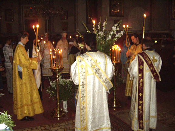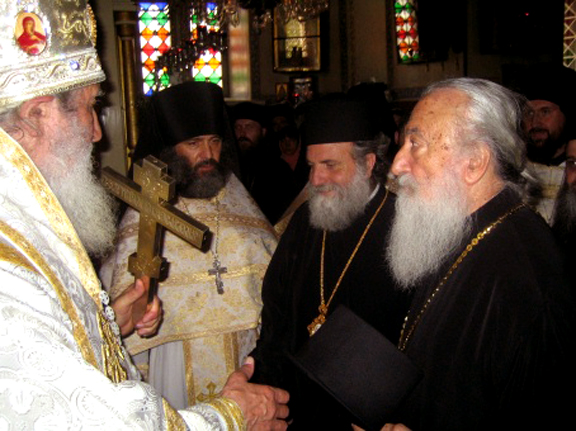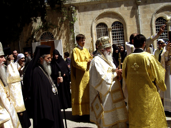 В сей нареченный и святый день сердечно приветствую Блаженнейшего Патриарха Феофила, помолившегося с нами сегодня, и хочу от имени нашей Русской Духовной Миссии в Иерусалиме выразить Вам, Блаженнейший Владыко, глубокую благодарность за отеческое попечение о наших монашествующих и клире, проходящем свое служение в наших святых обителях. Благодарю и сопровождающих Ваше Блаженство членов Священного Синода "Матери Церквей" и Свято-Гробское братство и желаю им мира душевного и радости духовной в их служении Пастыреначальнику Христу. Я рад также приветствовать Наблюдающего за делами нашей Миссии Преосвященнейшего архиепископа Марка, всечестную игуменью Моисею с сестрами обители и весь наш клир во главе с игуменом Андроником.