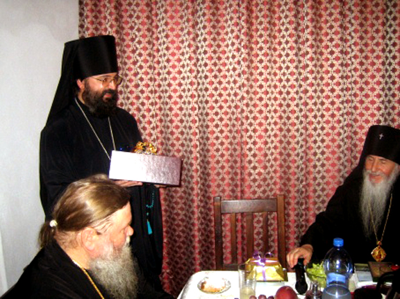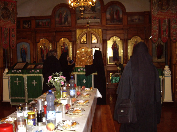 После многолетствий и целования креста была предложена праздничная трапеза, за которой произнесли приветствия Высокопреосвященнейший Митрополит Лавр, архиепископ Берлинский и Германский Марк, Начальник Духовной Миссии в Иерусалиме Московского Патриархата архимандрит Елисей, игуменья Елизавета и игуменья Моисея. Архимандрит Елисей преподнес настоятельнице обители лампаду, а игуменья Елизавета - крест, сделанный из дерева от гробов, в которых были привезены в Иерусалим новые преподобномученицы Елизавета и Варвара, с частицами их святых мощей. На трапезе также присутствовала игуменья Георгия, настоятельница Горненской обители.