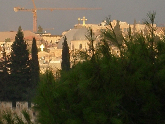Освящение креста на «Русских Раскопках» Утро на Святой Земле. Из-за гор Моава восходит солнце, и Иерусалим чудесно преображается, становясь золотым городом. Нет красивее картины первых послерассветных минут в Святом Граде Воскресения, особенно когда по небу плывут еще темные облака. Стоишь, любуешься и славишь Бога. И вот на фоне сего золотого города вдруг вспыхивает под лучами солнца, как некая утренняя звезда, большой православный крест на крыше храма святого Александра Невского, именуемого также «Русскими Раскопками» (Православное Палестинское Общество). Крест хорошо виден с Елонской горы, из Гефсимании. На днях было закончено его золочение и в самый престольный праздник совершилось его торжественное освящение. Событие знаменательное, историческое. Крест возвышается в самом сердце Иерусалима – вблизи храма Воскресения Христова. Восьмиконечный, трехметровый, бронзовый с позолотой – это и украшение Святого Града, и символ присутствия русского православия на Святой Земле. Иеромонаху Николаю Перекрестову – члену Русской Духовной Миссии Зарубежной Церкви выпала честь совершить чин освящения. Читая положенные псалмы, с трепетом произносили слова : «Внидемъ въ селения Его, поклонимся на место, идеже стоясте нозе Его», «Возносите Господа Бога нашего и поклоняйтеся подножию ногу Его, яко свято есть» – стоим на крыше храма, а слева купола Гроба Господня и близость Голгофы, а под нами Порог Судных врат, переступив которые, Христос был приведен на Лобное место.