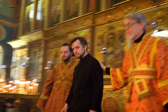Протоиерей Виктор Потапов тогда обвел хиротонисуемого вокруг престола трижды при пении священнослужителями и хором положенных ирмосов. После этого во время протяжного пения "Кирие элеисон" Владыка митрополит читал молитвы рукоположения, возложив руки на голову стоявшего на коленях ставленника. Последовало облачение нового иерея в священнические одежды: епитрахиль, пояс, фелонь, возложен был на него и иерейский серебряный наперсный крест, а в руки дан служебник, как символ того, что новорукоположенный священник имеет право совершать богослужения. Каждый раз, возлагая священные одежды на рукополагаемого, архиерей воглашал "Аксиос!", которое было трижды пропето священнослужителями в алтаре, а затем и церковным хором. В конце Высокопреосвященнейший митрополит Лавр вывел на амвон новопоставленного иерея, повернув его к народу для провозглашения конечного "Аксиос!"