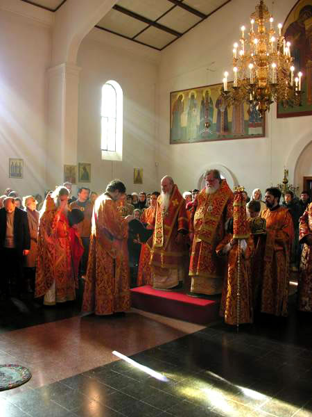 В конце чтения часов на средину храма вышел Берлинский и Германский архиепископ Марк и, восходя на кафедру, приветствовал гостя. На Божественной Литургии оба архиерея причащали народ, а затем архиепископ Феофан проповедовал о значении святых Новомучеников и о мытаре Закхее, о силе и свете покаяния.