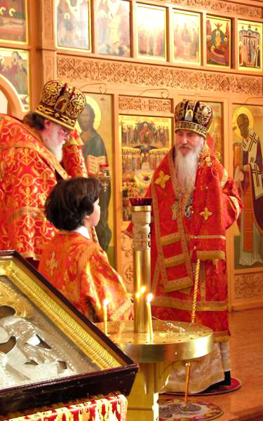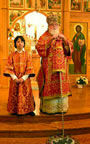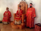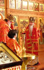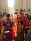 В храме, после многолетствий и «Вечной памяти», владыки приветствовали друг друга на солее подарками – владыка Феофан преподнес икону Святителя Николая (покровителя соборного придела), а владыка Марк золотом вышитые дорожку на аналогий и закладки для напрестольного Евангелия.