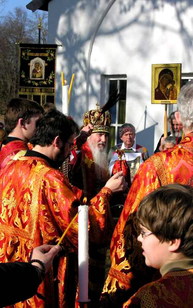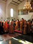 Владыка прибыл со своими иподиаконами. На архиерейскую встречу вышли ключарь собора, протоиерей Николай Артемов, протодиакон Георгий Кобро и диакон Александр Ролофф, а также соборные иподиаконы и прислужники. Владыку Феофана облачали посреди храма при пении соборного хора, руководимого Владимиром Владимировичем Циолковичем.