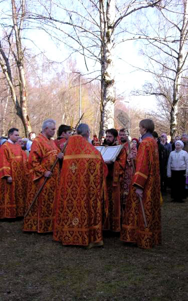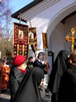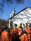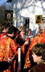 В завершение торжества последовал молебен с крестным ходом под торжественный колокольный звон вокруг храма, где с окроплением святой водой на четырех сторонах читались Евангелия воскресные и святым Новомученикам.