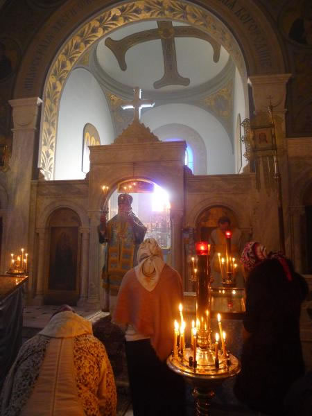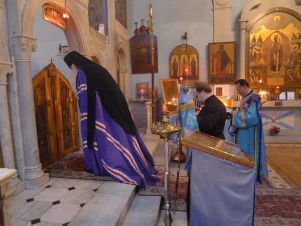 В слове проповеди Владыка Михаил коснулся истории праздника, а также истории русского храма, тесно связанного с первым лечебным домом, воздвигнутым в 1892 г. ментонским благотворительным обществом под покровительством Великой княгини Анастасии Михайловны. Благоприятный климат, способствовавший излечению туберкулеза сделал Ментон знаменитым среди соотечественников. На сегодняшний день в городе сохранилось немало памятников архитектуры, которые свидетельствуют об обильном присутствии наших соотечественников в прошлом. Часовня на местном кладбище, многочисленные могилы выходцев из России как в Ментоне, так и в соседних коммунах, и среди них: могила Великого князя Александра Михайловича и его жены Ксении Александровны, сестры св. Императора Николая II (Эти захоронения находятся в соседнем городке Рокбрюн-Кап-Мартан, практически слившимся с Ментоном – Ред.); скульптуры Леопольда Бернштама и Евгения Лансере на площадях и улицах города.
