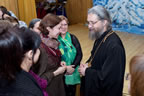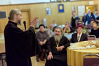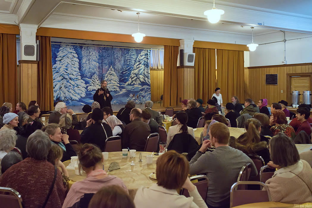 После литургии был совершен молебен святителю Иоанну и затем все желающие спустились в приходской зал на общую трапезу. После отец Петр Перекрестов, который до своего назначения в Сан-Франциско служил диаконом в Троицком соборе Торонто, беседовал с прихожанами. Он вкратце напомнил житие св. Иоанна и рассказал, как проходило открытие его мощей и прославление. Беседа длилась 2 часа – о. Петр отвечал на многочисленные вопросы верующих о чудесах св. Иоанна, о воспитании детей, о жизни православных в Калифорнии, о борьбе с унынием, - словом, обо всем, что волнует прихожан, включая вопрос о недавней встрече Святейшего Патриарха Кирилла и Папы Римского.