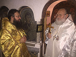 После целования креста Его Высокопреосвященство совершил славление у мощей своего небесного покровителя преподобного Илариона, схимника Печерского, и приложился к мироточивым главам.