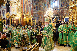 Его Святейшеству сослужили: Блаженнейший митрополит Киевский и всея Украины Онуфрий; митрополит Чебоксарский и Чувашский Варнава; митрополит Калужский и Боровский Климент, председатель Издательского Совета Русской Православной Церкви; митрополит Воронежский и Лискинский Сергий; митрополит Восточно-Американский и Нью-Йоркский Иларион, Первоиерарх Русской Православной Церкви Заграницей; митрополит Самарский и Тольяттинский Сергий; митрополит Истринский Арсений, первый викарий Патриарха Московского и всея Руси по г. Москве; митрополит Владимирский и Суздальский Евлогий; митрополит Тернопольский и Кременецкий Сергий; митрополит Ростовский и Новочеркасский Меркурий, председатель Синодального отдела религиозного образования и катехизации; митрополит Казанский и Татарстанский Феофан; митрополит Архангельский и Холмогорский Даниил; митрополит Тамбовский и Рассказовский Феодосий; митрополит Нижегородский и Арзамасский Георгий; митрополит Рязанский и Михайловский Марк, председатель Финансово-хозяйственного управления Московского Патриархата; митрополит Горловский и Славянский Митрофан; митрополит Ставропольский и Невинномысский Кирилл, председатель Синодального комитета по взаимодействию с казачеством; митрополит Смоленский и Дорогобужский Исидор; архиепископ Берлинский и Германский Марк; архиепископ Тираспольский и Дубоссарский Савва; архиепископ Верейский Евгений, председатель Учебного комитета Русской Православной Церкви, ректор Московской духовной академии; архиепископ Сергиево-Посадский Феогност, председатель Синодального отдела по монастырям и монашеству, наместник Троице-Сергиевой лавры; архиепископ Пятигорский и Черкесский Феофилакт; архиепископ Солнечногорский Сергий, руководитель Административного секретариата Московской Патриархии; архиепископ Кировоградский и Новомиргородский Иоасаф; архиепископ Салехардский и Ново-Уренгойский Николай; епископ Подольский Тихон; епископ Воскресенский Савва, первый заместитель управляющего делами Московской Патриархии, наместник Новоспасского ставропигиального монастыря; епископ Волынский и Луцкий Нафанаил; епископ Клинцовский и Трубчевский Владимир; епископ Бронницкий Парамон, наместник Донского ставропигиального монастыря; епископ Анадырский и Чукотский Матфей; епископ Люберецкий Серафим, председатель Синодального отдела по делам молодежи; епископ Рославльский и Десногорский Мелетий; епископ Гдовский Фома; протопресвитер Владимир Диваков, секретарь Патриарха Московского и всея Руси по г. Москве; архимандрит Павел (Кривоногов), благочинный Троице-Сергиевой лавры; протоиерей Николай Балашов, заместитель председателя Отдела внешних церковных связей Московского Патриархата; архимандрит Савва (Фатеев), наместник Саввино-Сторожевского ставропигиального монастыря; насельники Лавры в священном сане.