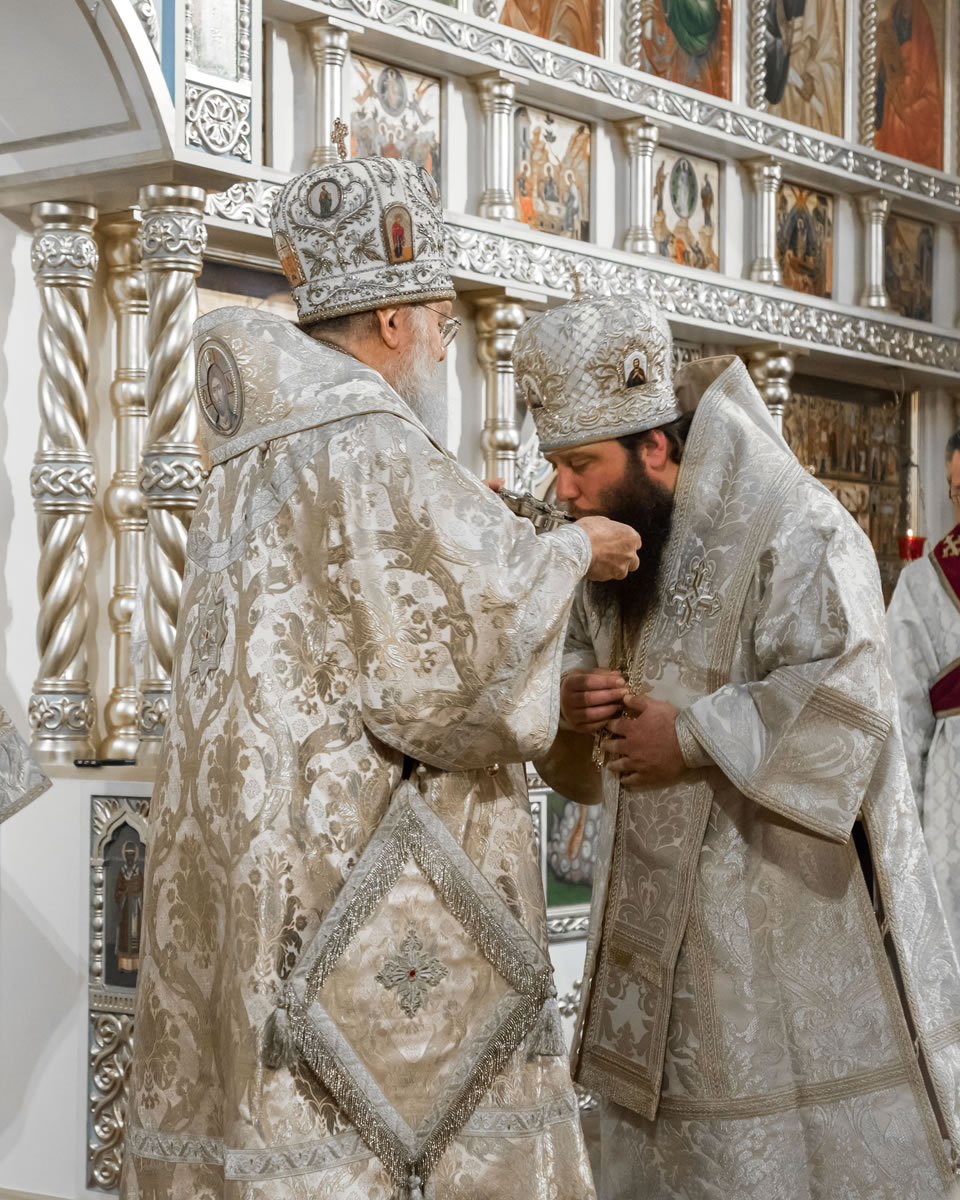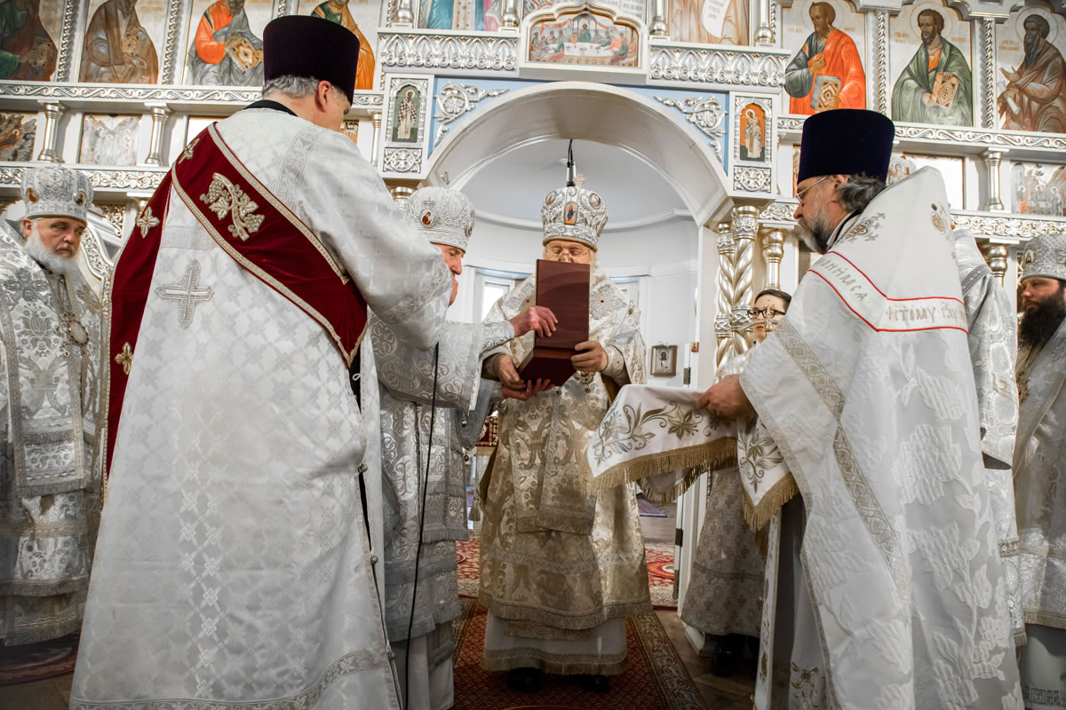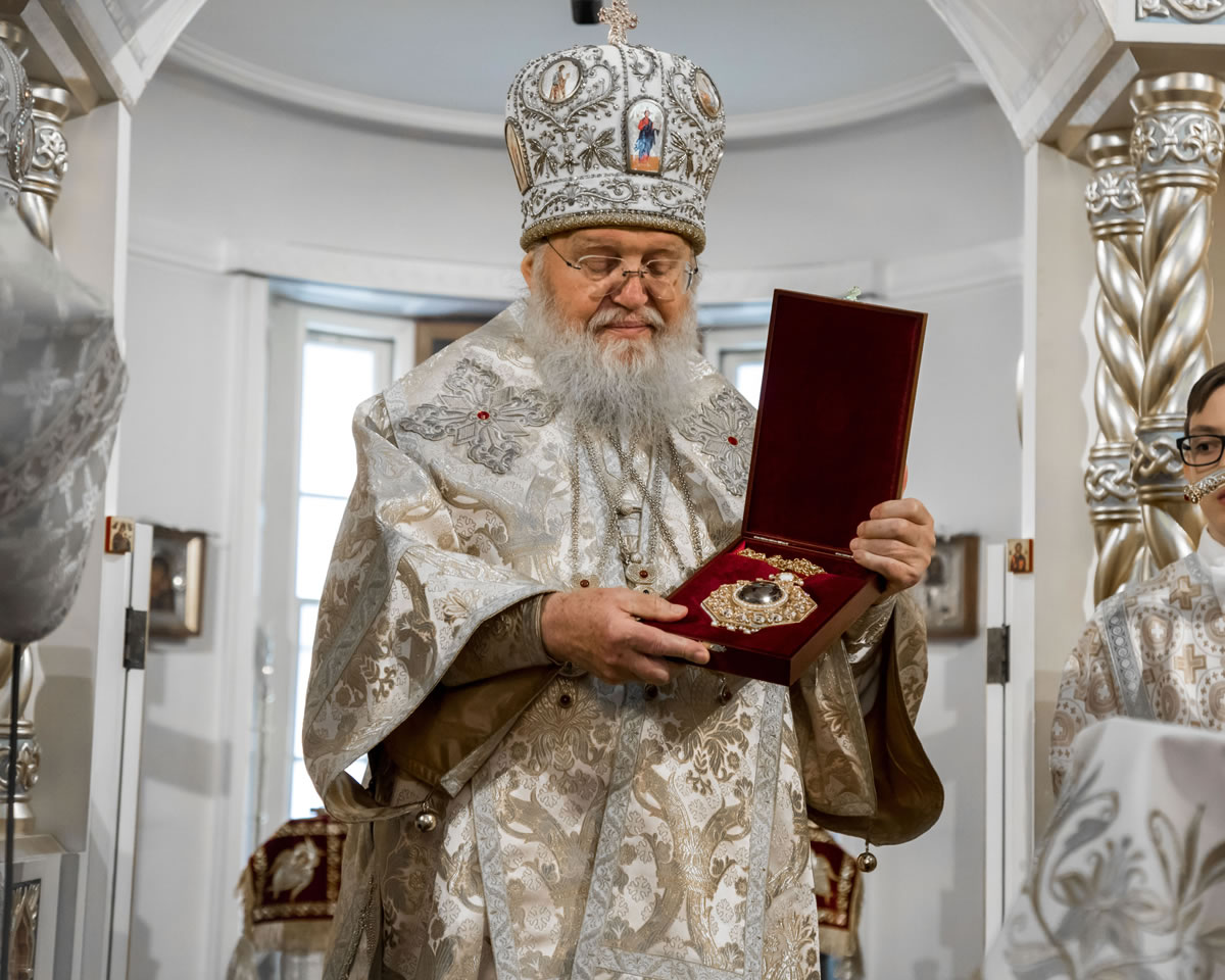 Перед целованием креста от имени всей Полноты Русской Зарубежной Церкви архиепископ Берлинский и Германский Марк, первый заместитель Председателя Архиерейского Синода Русской Зарубежной Церкви, поздравил Его Высокопреосвященство и преподнес ему памятную панагию, сделанную в Первопрестольном граде, с дарственной надписью.