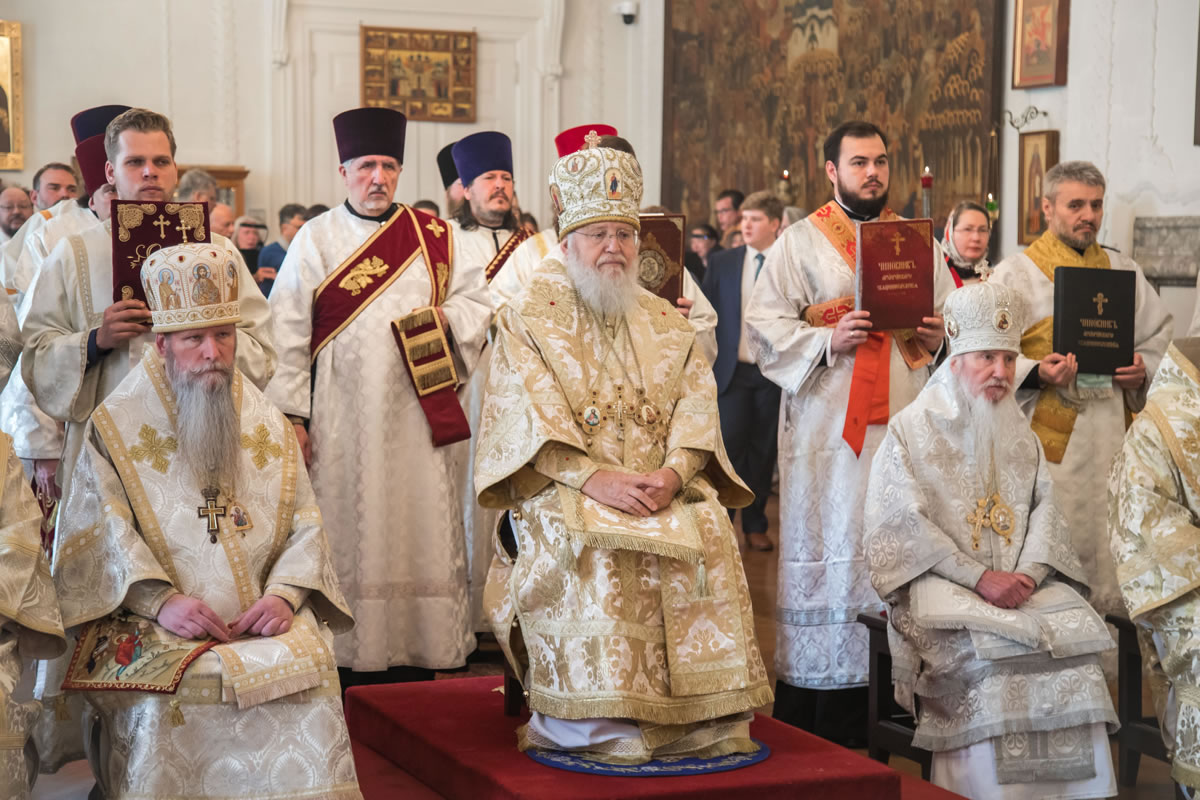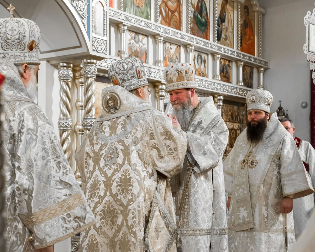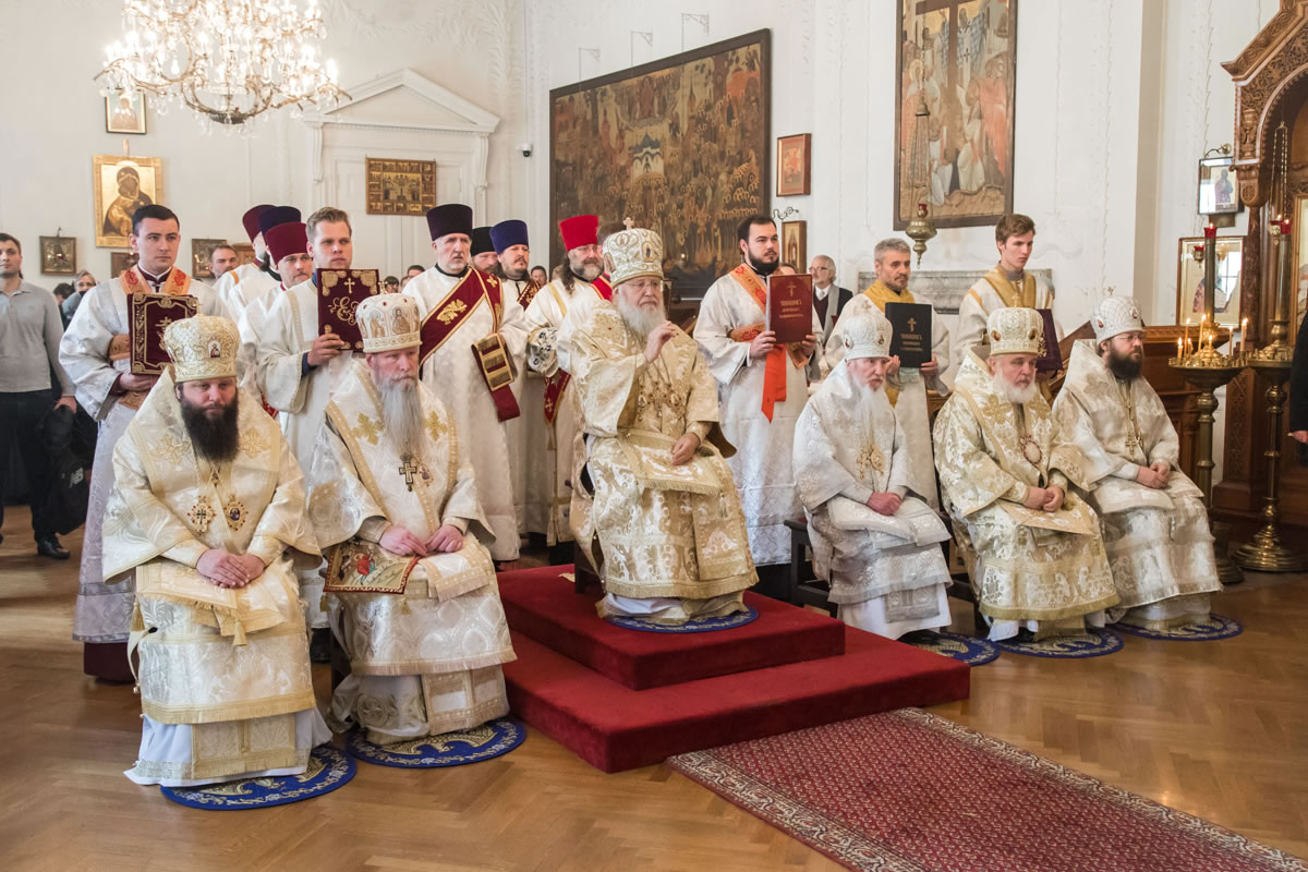 Перед целованием креста от имени всей Полноты Русской Зарубежной Церкви архиепископ Берлинский и Германский Марк, первый заместитель Председателя Архиерейского Синода Русской Зарубежной Церкви, поздравил Его Высокопреосвященство и преподнес ему памятную панагию, сделанную в Первопрестольном граде, с дарственной надписью.