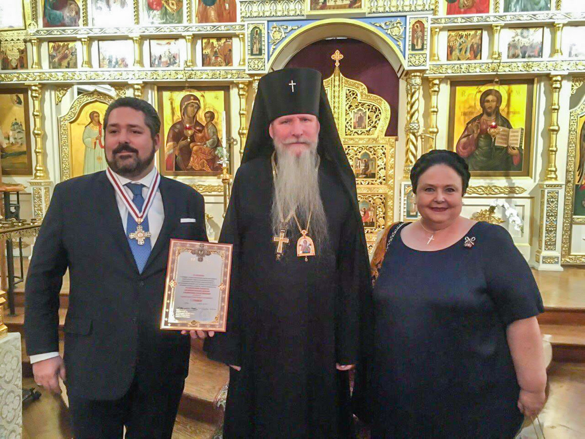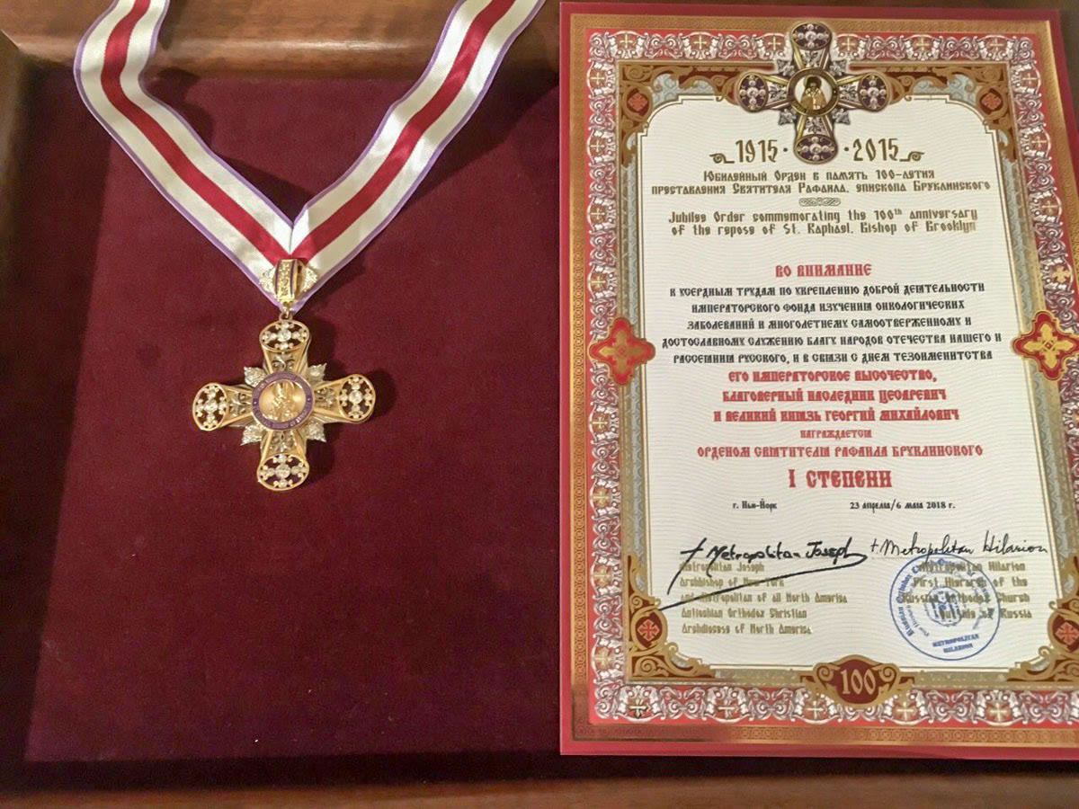 По благословению митрополита Восточно-Американского и Нью-Йоркского Илариона Высокопреосвященнейший владыка Кирилл «За усердные труды по укреплению доброй деятельности Императорского Фонда изучения онкологических заболеваний и в связи с многолетним, самоотверженным и достославным служением благу народов Отечества нашего и Рассеяния Русского», вручил Великому Князю Георгию Михайловичу орден Cвятителя Бруклинского Рафаила I степени, а Великой Княгине Марии Владимировне –памятный дар.