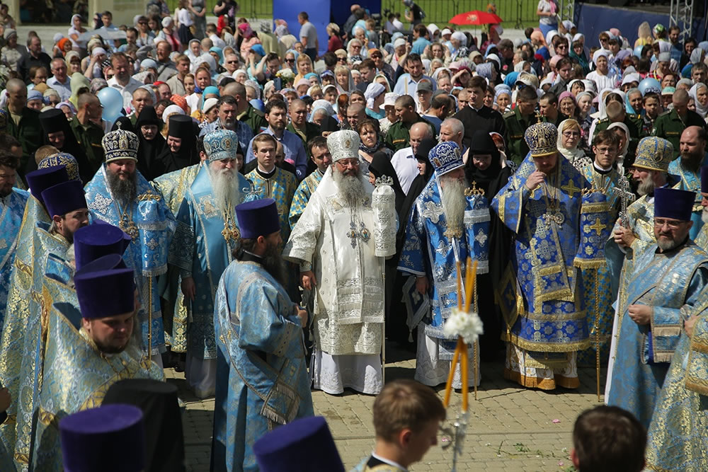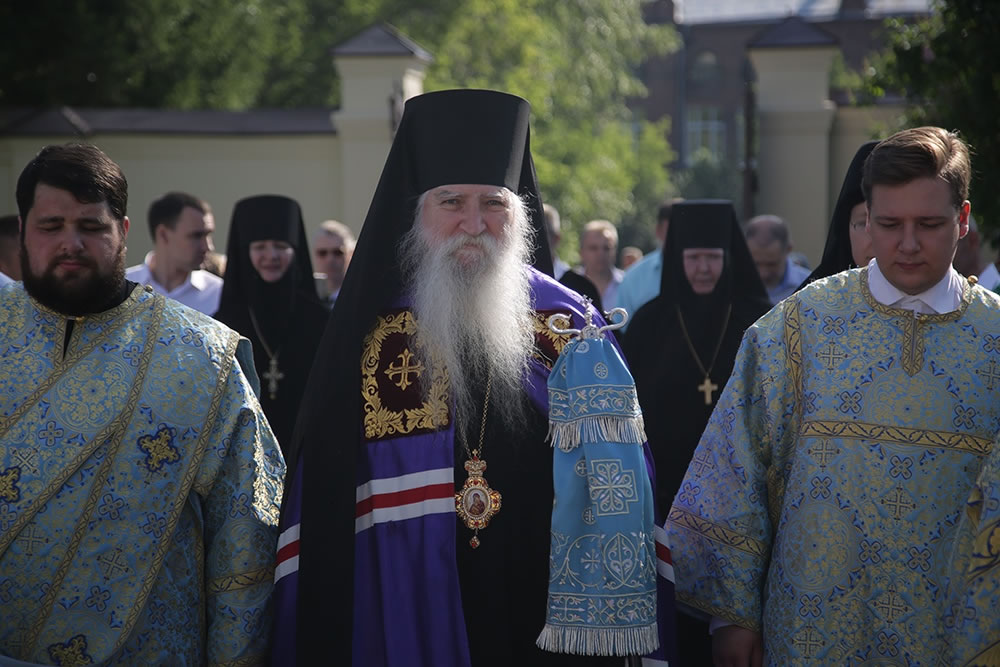 По завершению праздничного богослужения архипастыри возглавили традиционный крестный ход вокруг Александро-Невского собора с главной иконой – Тихвинским образом Богоматери.