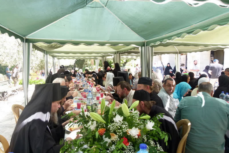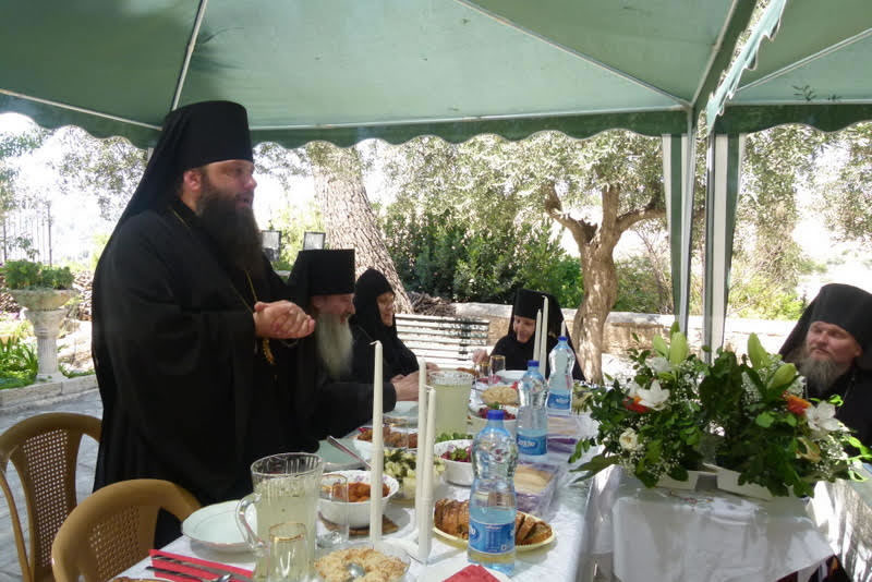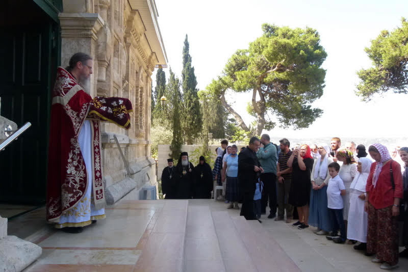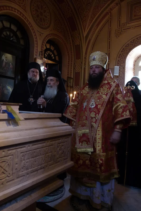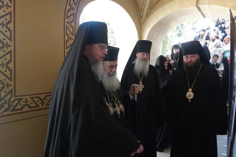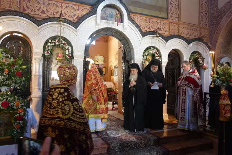К концу Божественной литургии храм посетил Блаженнейший Патриарх Иерусалимский и всея Палестины Феофил III, радостно приветствовавший Преосвященного епископа Николая, архимандрита Романа и всех собравшихся. В своем слове, произнесенном на английском языке, Его Блаженство рассказал о значении подвига преподобномученицы Елизаветы и пожелал игумении Елизавете с сестрами многих милостей и благословений Божиих в несении своего монашеского делания.