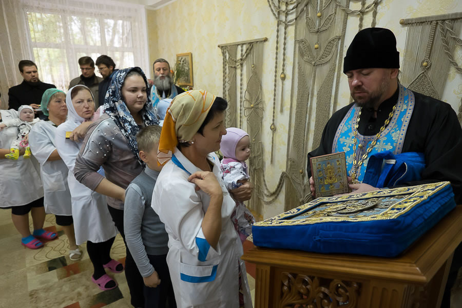 Затем чудотворная икона была принесена в Областной специализированный Дом ребенка. Во время совершения молебна Божией Матери сотрудники Дома ребенка подносили и подводили детей приложиться к иконе. По окончании молебна протоиерей Александр Лобанов посетил с чудотворным образом палату с тяжелобольными детьми.