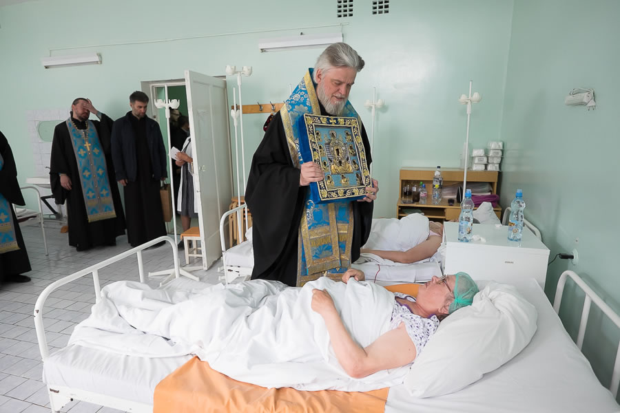Завершилось посещение лечебных учреждений в Курской областной клинической больнице, где чудотворный образ был принесен пациентам реанимации.
