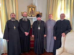 Во вторник, 22 ноября, клирики Канадской епархии помолились за Божественной литургией, после чего были приняты в покоях Высокопреосвященнейшего митрополита Николая. Здесь Его Высокопреосвященство дал прием в честь гостей. В беседе за трапезой, прошедшей в теплой и дружественной атмосфере, гости рассказали митрополиту Николаю и труждающимся в канцелярии Архиерейского Синода о церковной жизни Канадской епархии.