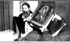 Иерусалимская икона, присланная с Афона вдовствующей имп. Марии Федоровне, начала мироточить в 1995 г. На фото о. Николай и иером. Алексей (Бирон). 1996 г.