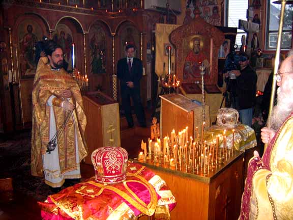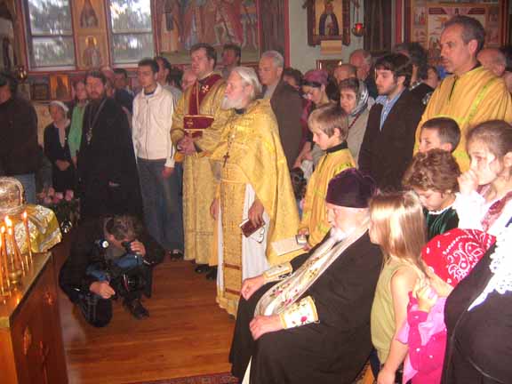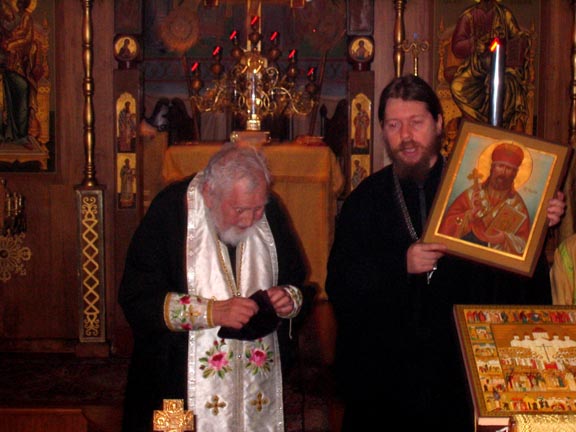 After Divine Liturgy, the vestments intended for the Patriarch of Moscow and All Russia, and for Diveevo Monastery, were taken out of the altar into the middle of the church and laid beside the pannikhida table, where Fr Roman led the commemorative service along with Fr Victor, Protopriest Alexei Mikrikov and the parish clergymen. After the singing of Eternal Memory , the Parish Rector then welcomed Fr Tikhon and spoke about the life of Vladyka Philaret. In a moving response, Archimandrite Tikhon noted the importance of this event for the Russian Orthodox Church and gave Fr Roman a pectoral cross from His Holiness, along with an icon of Holy New Martyr Archbishop Ilarion (Troitsky) of Verey, containing a portion of his relics, for Epiphany Church. The choir, under the direction of Vladimir Pavlovich Roudenko, then sang Bortniansky's Tebe Boga khvalim , and for a long time, the multitude of worshipers approached to venerate the vestments of the third First Hierarch of the Russian Orthodox Church Outside of Russia.