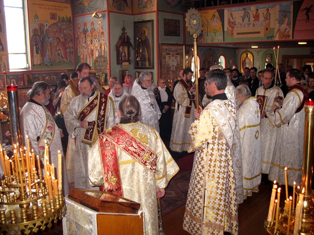 On January 21, the Sunday after the Epiphany of the Lord, His Eminence Metropolitan Laurus served at Divine Liturgy along with Protopriest Andre Papkov and Protopriest Alexei Mikrikov, Priest Nicholas Bargoot, Priest Victor Boldewskul and many deacons, with a multitude of altar boys, singers and worshipers. During Divine Liturgy, Mitred Protopriest Roman Lukianov, the long-time Rector of the parish, partook of the Holy Mysteries of Christ. During the minor entrance, His Eminence awarded the kamilavka to Fr Victor, saying that in connection with the retirement of Fr Roman as Rector, Fr Victor is now appointed as his successor, then proclaiming "Axios!"