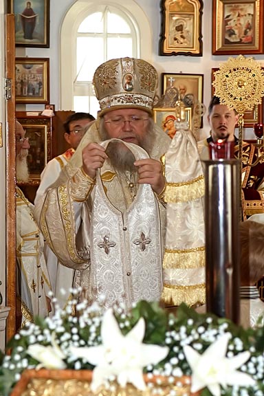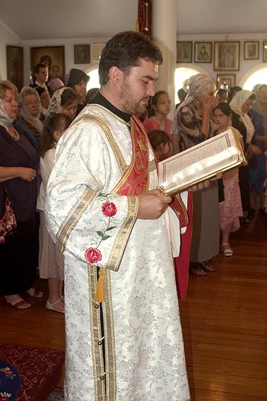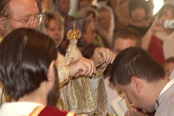 After the vesting of the Hierarch, at the sixth hour, Vladyka Hilarion tonsured Vasiliy Konstantinidis to Reader to serve at St Nicholas Cathedral. The hours then continued. During Liturgy, when came the time for the ordination of Deacon Gabriel Lapardin, Vladyka placed the aer on the head of Fr Gabriel. Fr Gabriel then proceeded to the middle of the Church to await him time. When the great entrance concluded, Deacon Alexander Borodin and Deacon Konstantin Semovskih led Fr Gabriel to the Royal Doors, as they had done the day before for Fr John Weir. So began the ordination of Fr Gabriel to the priesthood. At the end, Vladyka led the newly-ordained priest to the Royal Doors and exclaimed, “Axios!” to which all the clergy replied, "Axios!" thrice, followed by the response from the choir.