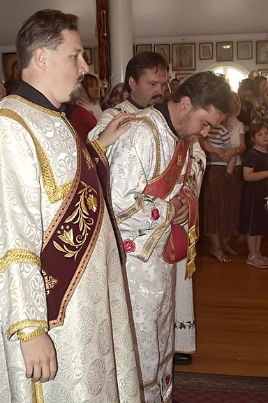 The Liturgy, on the next day, was officiated by Archbishop Hilarion himself. People had gathered early that morning to greet the Holy Icon and to pray at the Liturgy at which there would be an ordination to the priesthood. This was an exciting event for Brisbane, as the last ordination to the priesthood was approximately 25 years ago. At this Liturgy, all of the clergy concelebrated with the Archbishop. For the deacons of the Rocklea Parish, it was an emotional occasion as one of their number was going into the Priesthood. At the appropriate moment after the Cherubic hymn, the ordination began. Vladyka read the prayers of ordination and then led the newly-ordained priest John to the Royal doors exclaiming “Axios!” This was resoundingly repeated thrice by all the clergy and then by the choir, responding on behalf of the congregation. The Liturgy then continued in the usual manner. After the end of the Liturgy, Vladyka gave the Holy Cross to father John to accept the congratulations of the congregation.