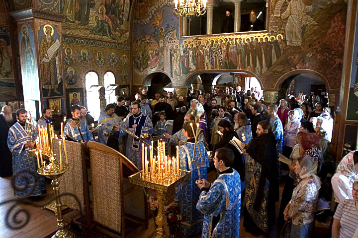 Vespers and compline were then performed, as usual. Afterwards, an akathist was performed before the Reigning Icon of the Mother of God at the parvis [entryway] of the cathedral.