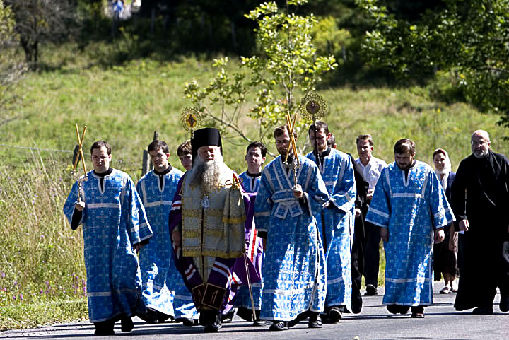On Saturday, September 1, at 3 pm, a grand procession of the cross was made to the cemetery's Dormition Church, which stands on a hill to the north of the monastery cathedral. Surrounded by the graves of the dearly departed, this white stone church gleams with its silver cupolas and crosses. The celebration was being held during the period of the Dormition of the Most-Holy Mother of God, so the prayers sung during the procession were for that feast day.