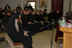 After a solemn procession from the monastery Cathedral to the Seminary hall, Metropolitan Hilarion blessed an icon of the Old Testament Holy Trinity, which had been placed above the main entrance into the Seminary. This work had been completed by the one of the graduates of HTS, iconographer and reader Alexei Lemmer, who will continue his studies in the art of iconography at the Moscow Theological Academy beginning September of 2008. The acting Rector, Archimandrite Luke, offered opening remarks, and welcomed the clergy, students and guests. Metropolitan Hilarion congratulated the graduating class, and offered his thoughts on the significance of their completed spiritual path. The graduation address was delivered by Protopriest Pimen Simon of Holy Nativity Church in Erie, PA.  Fr Pimen, who joined the Russian Orthodox Church Outside of Russia together with his community of (formerly priestless) Old-Ritualists twenty-five years ago, encouraged the graduating class to expect God’s will to be different from their own and to accept it with love and obedience.  Love, Fr Pimen explained, is the primary and most important virtue of a servant of Christ, without which all pastoral strivings will be fruitless and even harmful for the souls of the pastor and his flock.