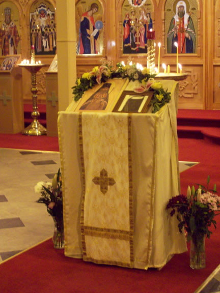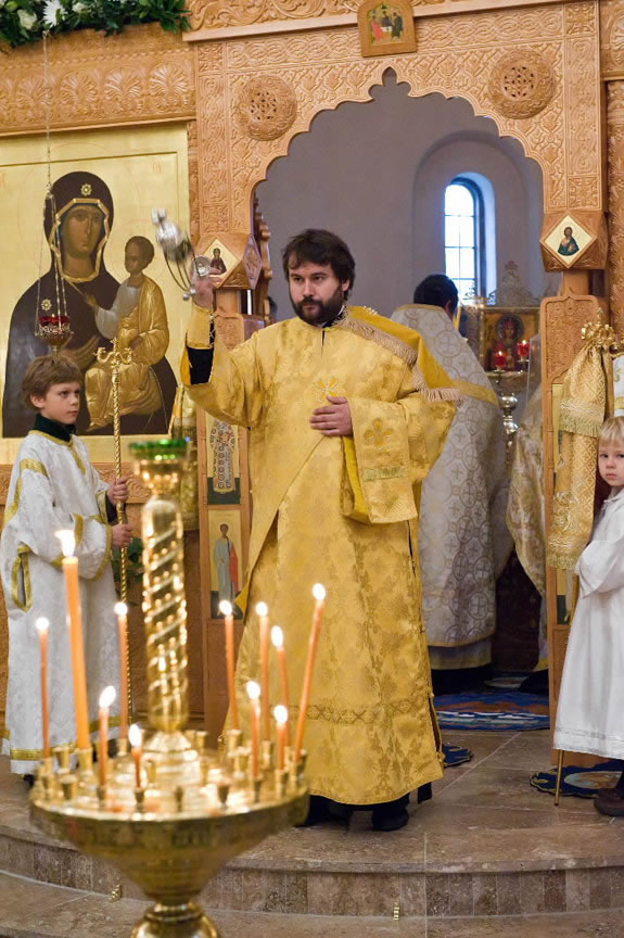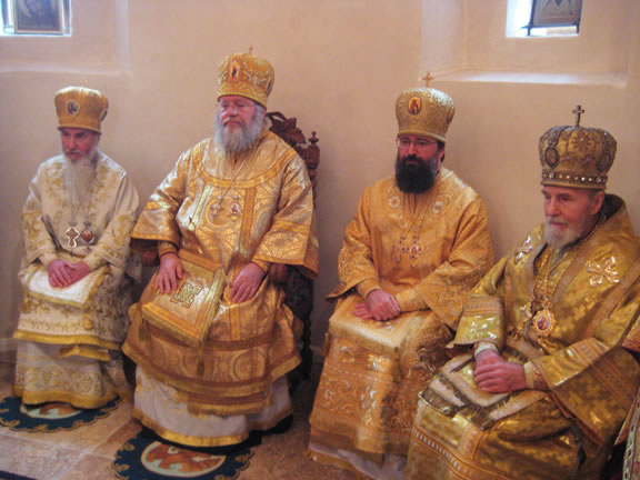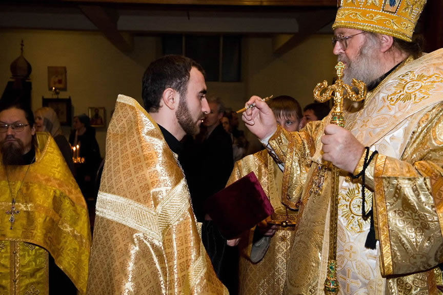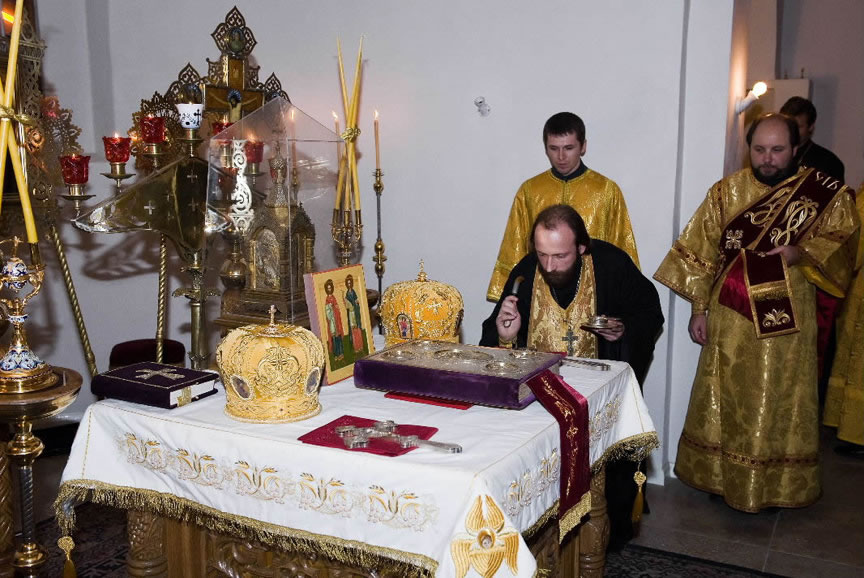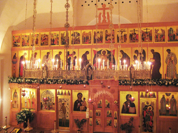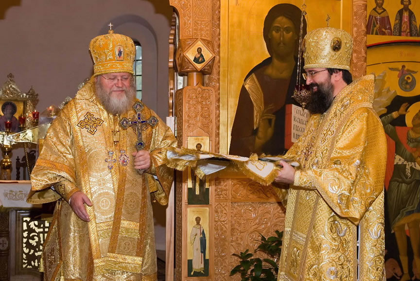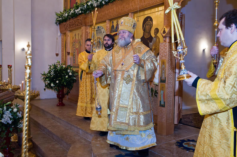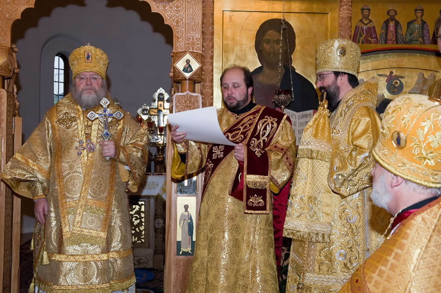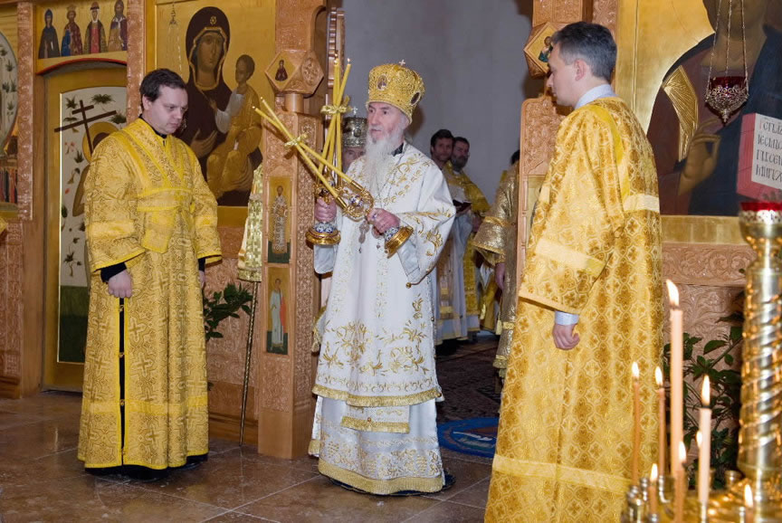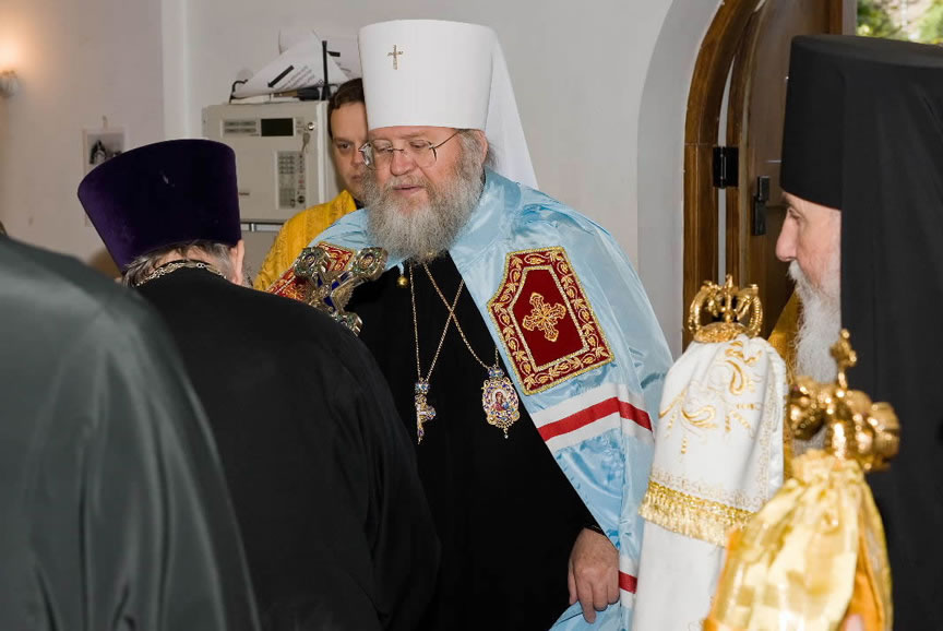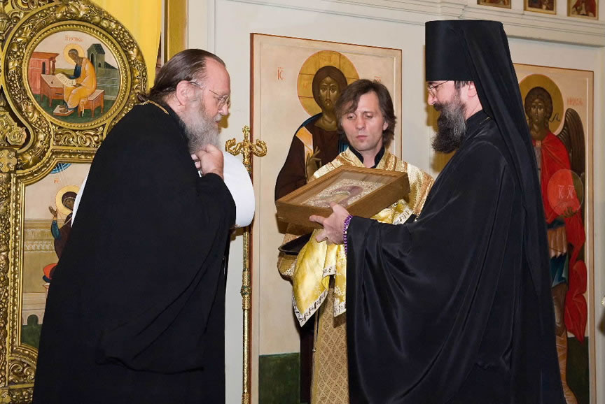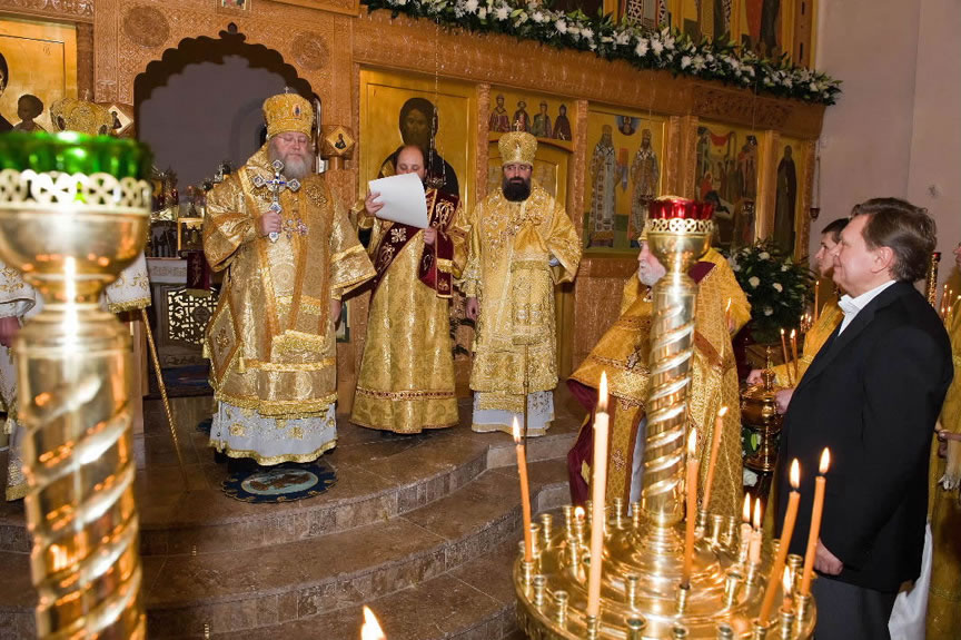 On November 14, His Eminence officiated at Divine Liturgy at Nativity of the Mother of God Cathedral in London along with His Eminence Archbishop Mark of Berlin and Germany, Administrator of the Parishes of the Russian Church Abroad in Great Britain; His Grace Bishop Elisei of Sourozh; and His Eminence Archbishop Anatoly of Kerchensk, and many local clergymen. After the end of Divine Liturgy, His Eminence consecrated the new iconostasis and panikadilo (chandelier) in the upper church. Then His Eminence gave a gramata (decree of blessing) from the President of the Synod of Bishops to SD Kondrashov "in view of his earnest labors, generosity and active participation in church life."
