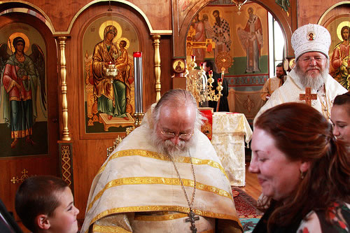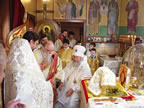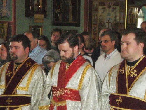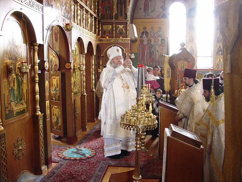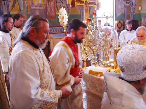 On Saturday evening, His Eminence officiated at all-night vigil, and on Sunday, he led the celebration of Divine Liturgy. Vladyka was joined by Priest Victor Boldewskul, Rector of Epiphany Church; Priest Alexei Aedo of Chile; Priest Brendan Crowley (during vigil); along with Protodeacon Joseph Jarostchuk; Protodeacon Thomas Reske; Protodeacon Nicholas Drobot; Deacon Alexander Jarostchuk; Deacon Nicholas Olhovsky andDeacon Eugene Kallaur. During the minor entrance, Deacon Alexander was elevated to the rank of protodeacon. His Eminence also performed two ordinations: after the Great Entrance, Protodeacon Thomas Reske was ordained to the priesthood, and after the Eucharistic Canon, Vladyka Hilarion ordained Subdeacon Victor Ganson to the deaconate. It is interesting that on this same day, Hieromonk Joasaph (MacLellan), who grew up in Epiphany Church and was a reader and choir director at the parish, was elevated to the rank of archimandrite in Munich.
