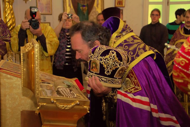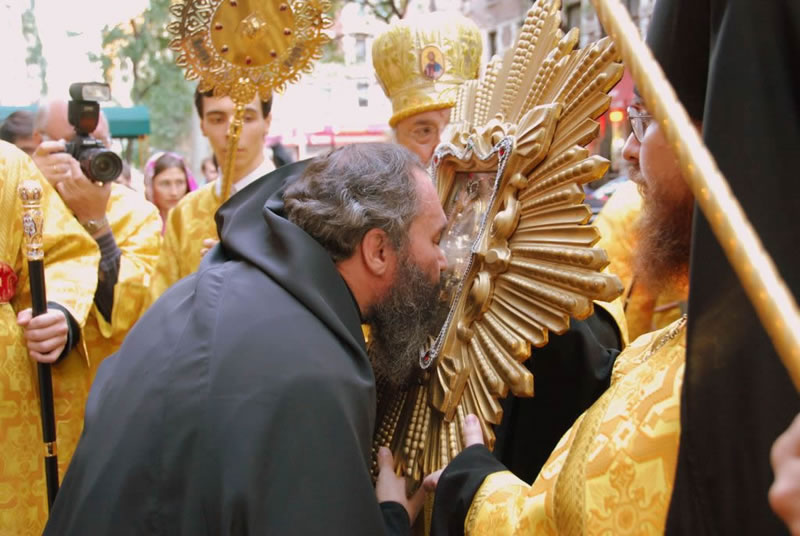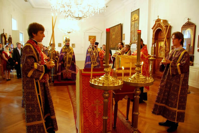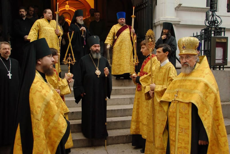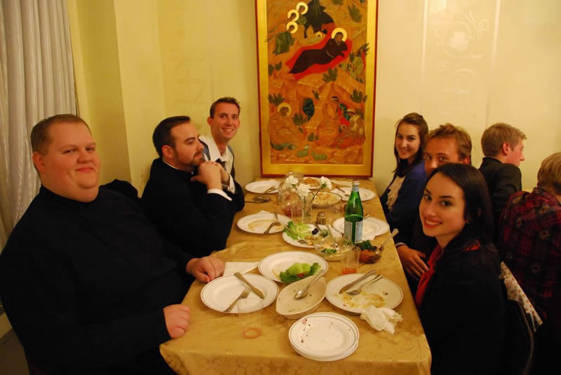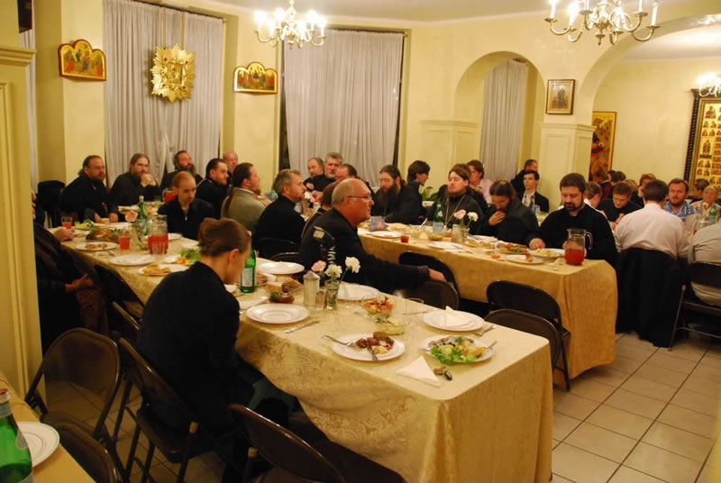 Later that day the symposium members prayed at all-night vigil at St Nicholas Patriarchal Cathedral, where the Pochaev Icon of the Mother of God was brought from Holy Trinity Monastery in Jordanville This icon was brought out of Russia in 1920. After the service, the ROCOR and Patriarchal clergymen and youth, along with Vladyka Justinian and Vladyka Jerome, continued their discussions at a trapeza.