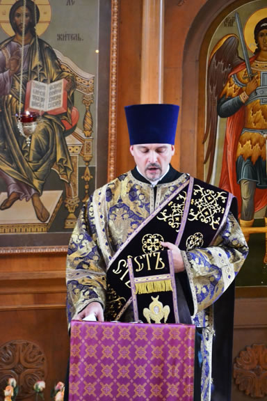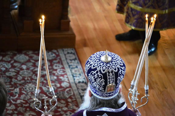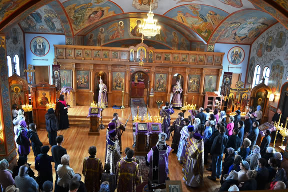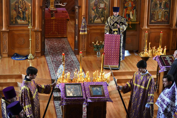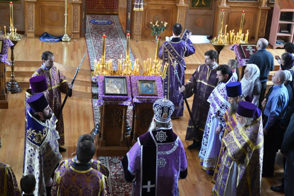 On Sunday, March 24, 2013, the Sunday of the Triumph of Orthodoxy, His Grace Bishop Peter of Cleveland, Administrator of the Diocese of Chicago and Mid-America of the Russian Orthodox Church Outside of Russia, performed the Rite of Orthodoxy following Divine Liturgy of St Basil the Great. His Grace was joined by Protopriest Andre Papkov, Senior Priest of the Cathedral; Protopriest Vasyl Kuzmych; Priest Valeri Vovkovsky; Priest Tarasiy Maximtsev; Priest Leonty Naidzions, as well as Protodeacon Vadim Gan and Protodeacon Alexander Kichakov. Praying in the altar during Divine Liturgy was His Eminence Archbishop Alypy of Chicago and Mid-America.