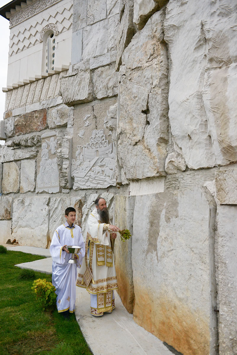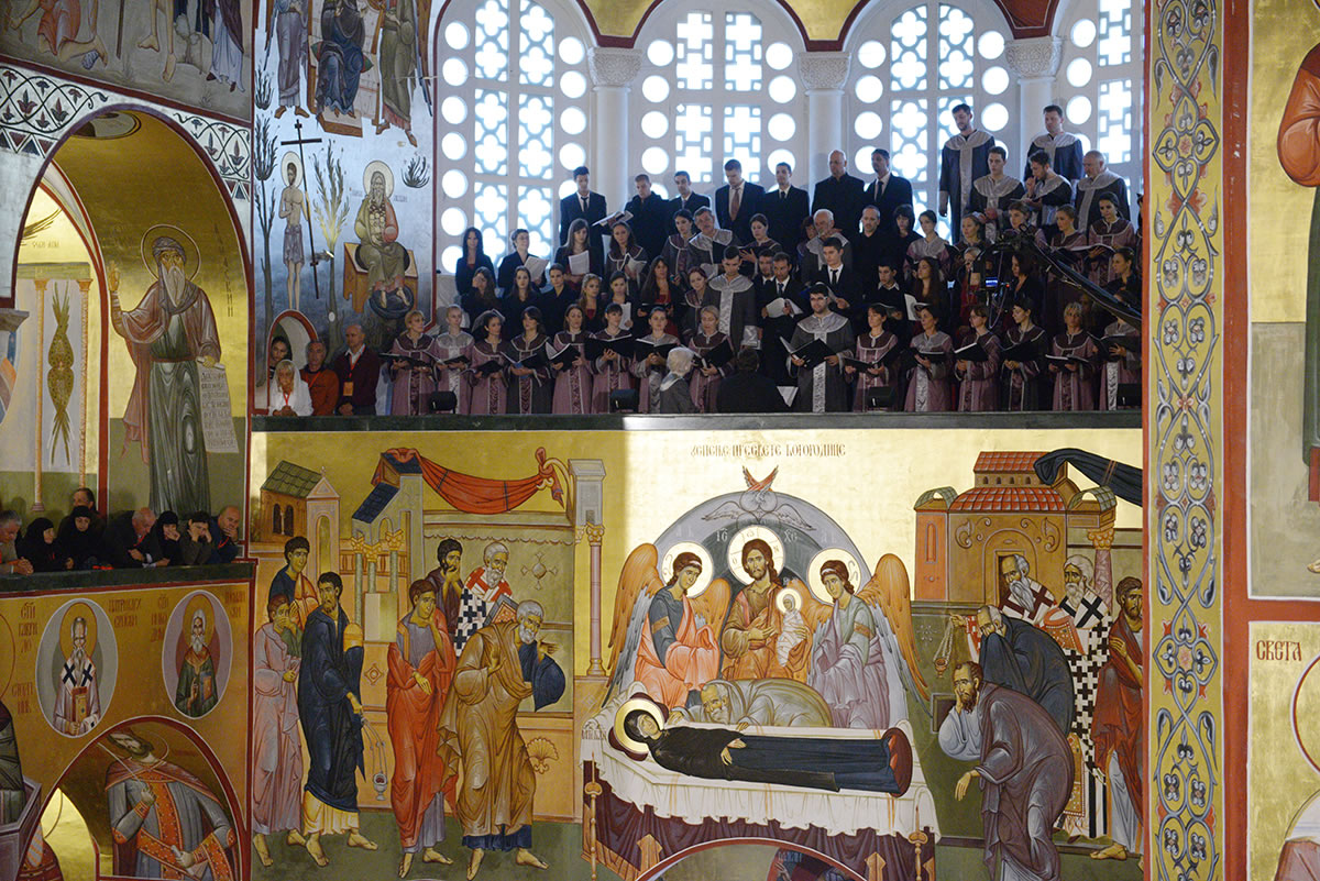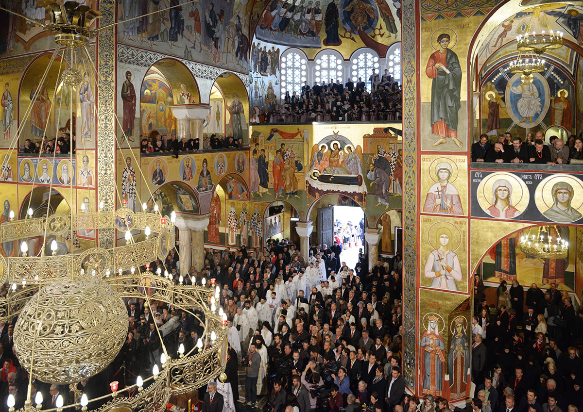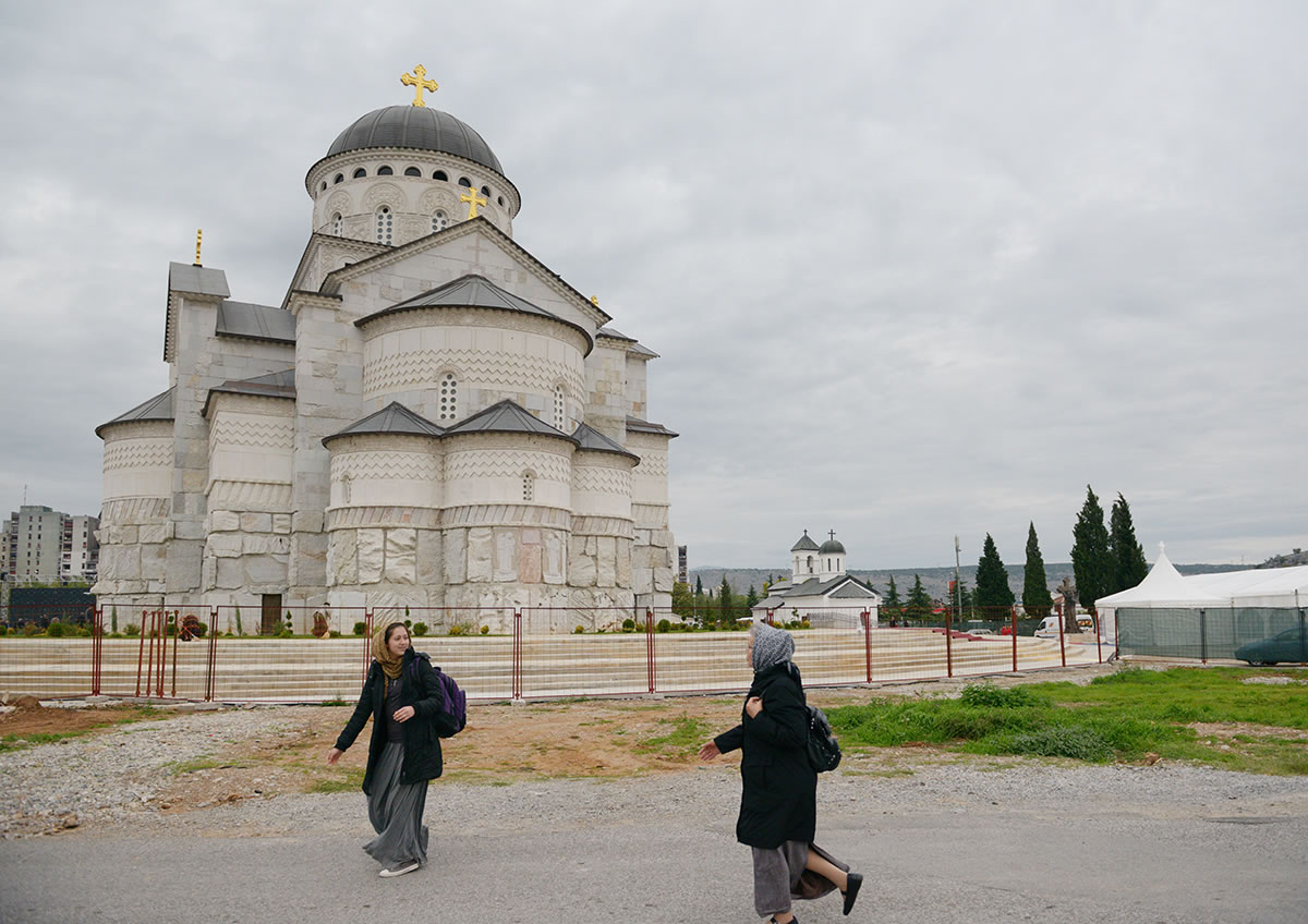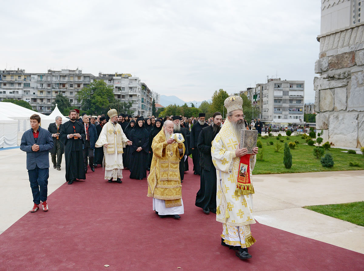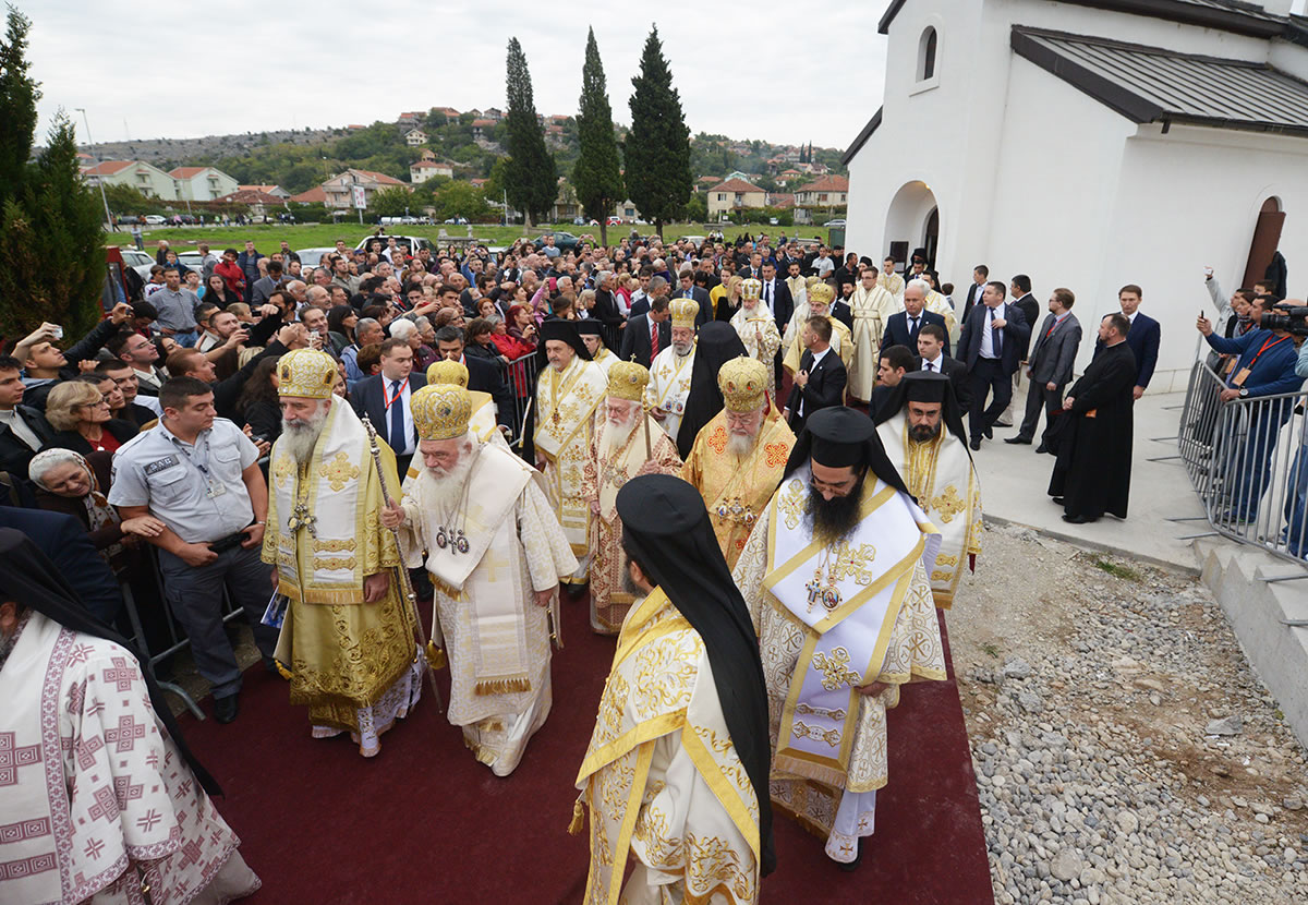 Later that day, Archbishop Mark and the other delegates went to Podgorica, Montenegro (Crna Gora), where they were welcomed on the plaza in front of the new cathedral with folk music and dances. Montenegran President Filip Vujanovic gave a fiery speech on Orthodoxy in his country. The following day, the newly-built Cathedral of the Resurrection of Christ was consecrated. During a procession of the cross, Archbishop Mark carried the holy relics which were placed under the altar table. President Nikolic was present at the consecration along with other Serbian government representatives, President Milorad Dodik of the Serbian Republic entity of Bosnia and Herzegovina , as well as representatives of Catholic, Protestant, Anglican and Muslim communities.