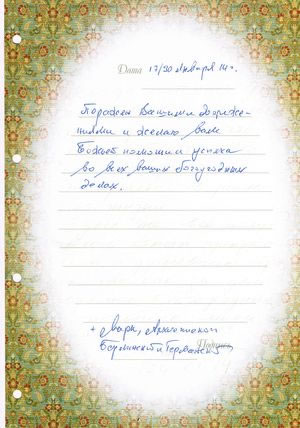 Mr Sergei Stepashin, President of the IPPO, congratulated Vladyka Mark on his namesday and gave him a Gzhel porcelain souvenir bearing the symbol of the IPPO. Together with Mr Grachev, they discussed ongoing affairs of the two Palestine Societies in the Holy Land.