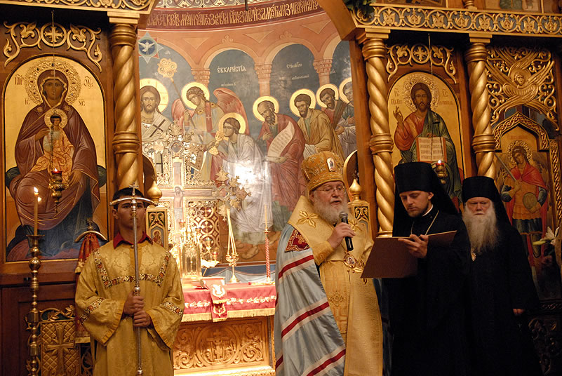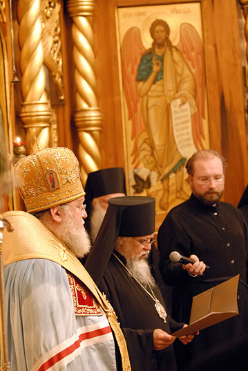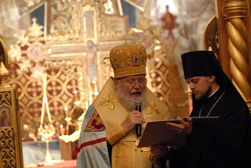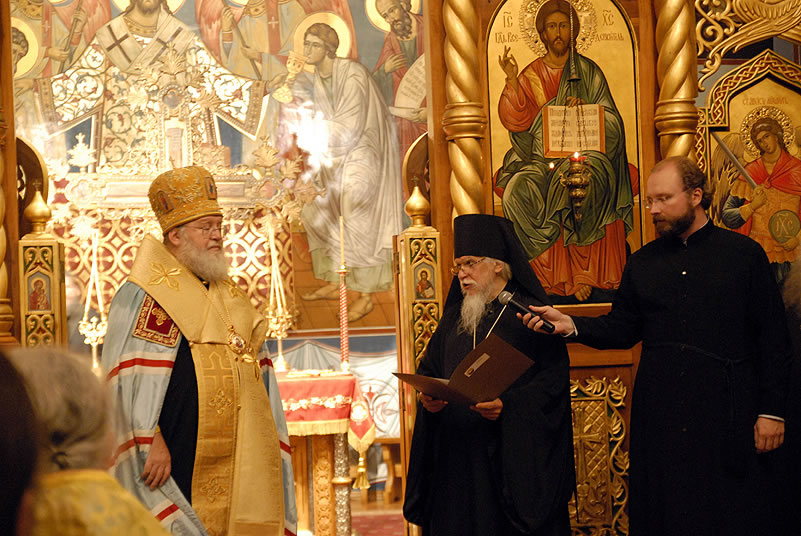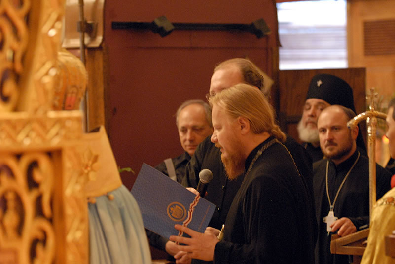 The greeting of His Holiness Patriarch Kirill of Moscow and All Russia was read by Bishop Panteleimon. The epistle of His Eminence Metropolitan Onouphry, locum tenens of the Kievan Metropoliate was read by Bishop Iona, who also relayed to Vladyka Hilarion the heartfelt support and greeting from Metropolitan Onouphry, and offered him a gift of a panaghia.