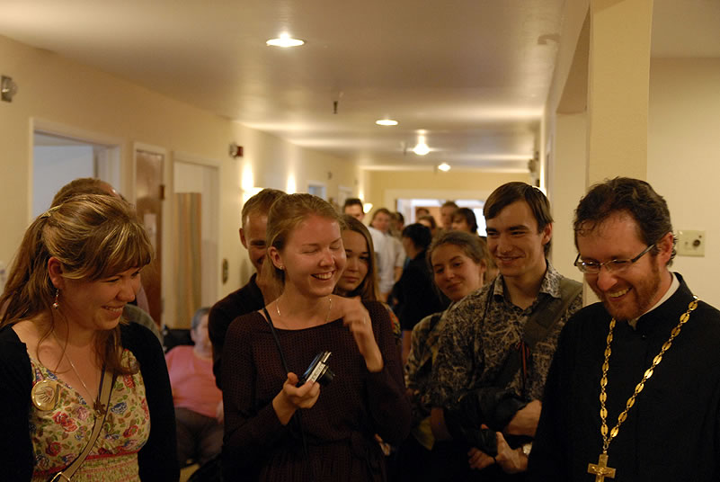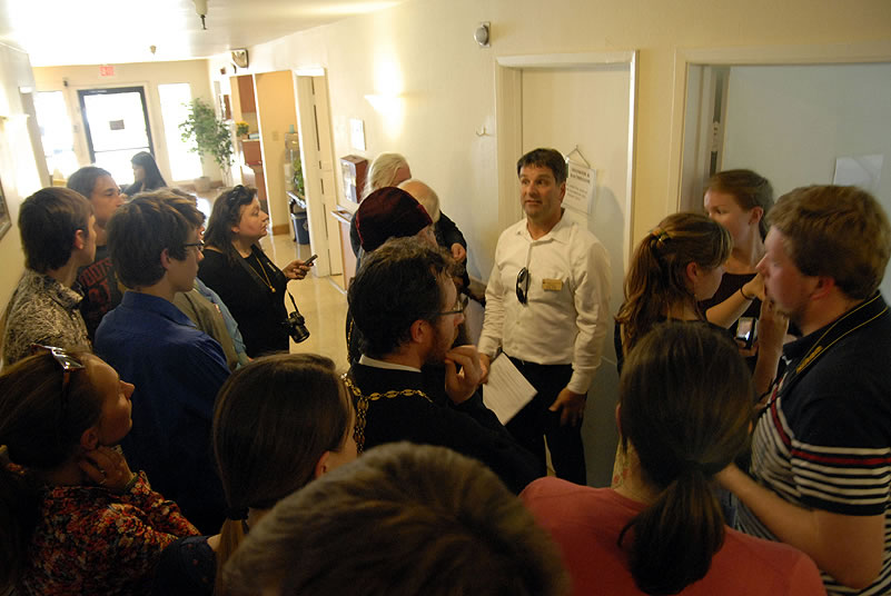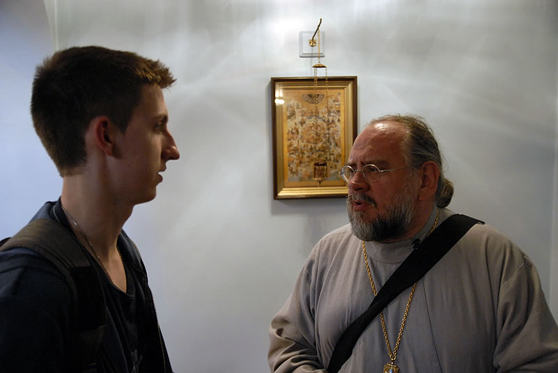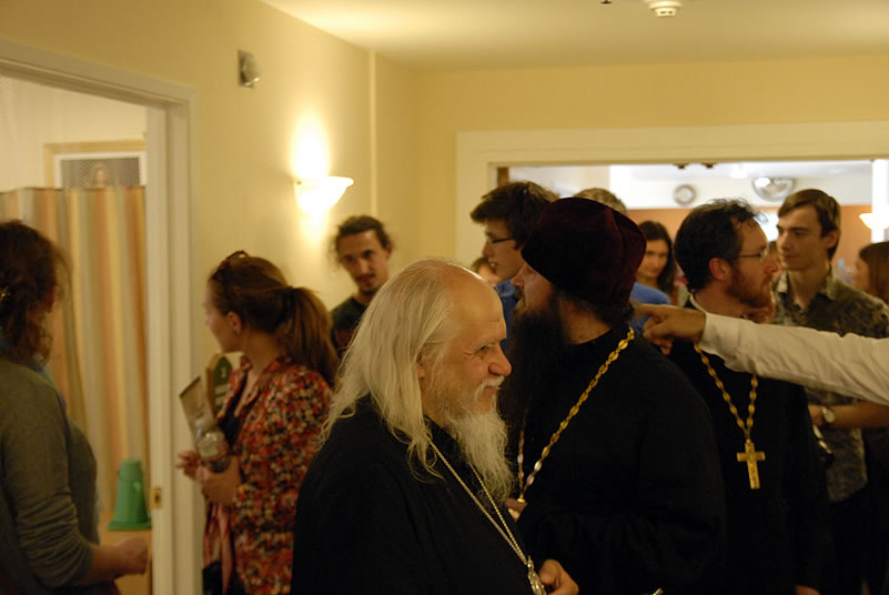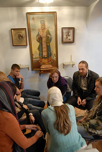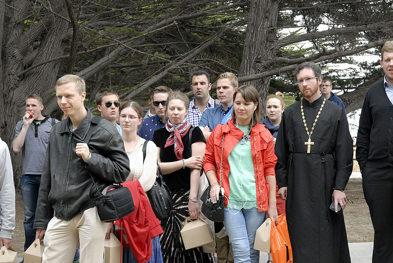 After Liturgy, the conferees heard a lecture by His Grace Bishop Panteleimon of Orekhovo-Zuevsk, President of the Synodal Department on Charity and Social Service of the Moscow Patriarchate, after which they broke up into groups and visited two charitable institutions to view their operations. The first was St Anthony’s Kitchen, where approximately 300 homeless people are fed daily. Then Protopriest Stefan Pavlenko gave the group (including Bishop Panteleimon) a tour of St John Kronstadt Care Center and its chapel. Vladyka Panteleimon and Fr Stefan performed a moleben service, after which the hierarch blessed the Orthodox Christian patients of the senior home. The staff took the group on a tour and answered questions, after which they offered a Russian-style lunch. That evening, the youth took a tour of the city and returned to the conference center to work in groups.