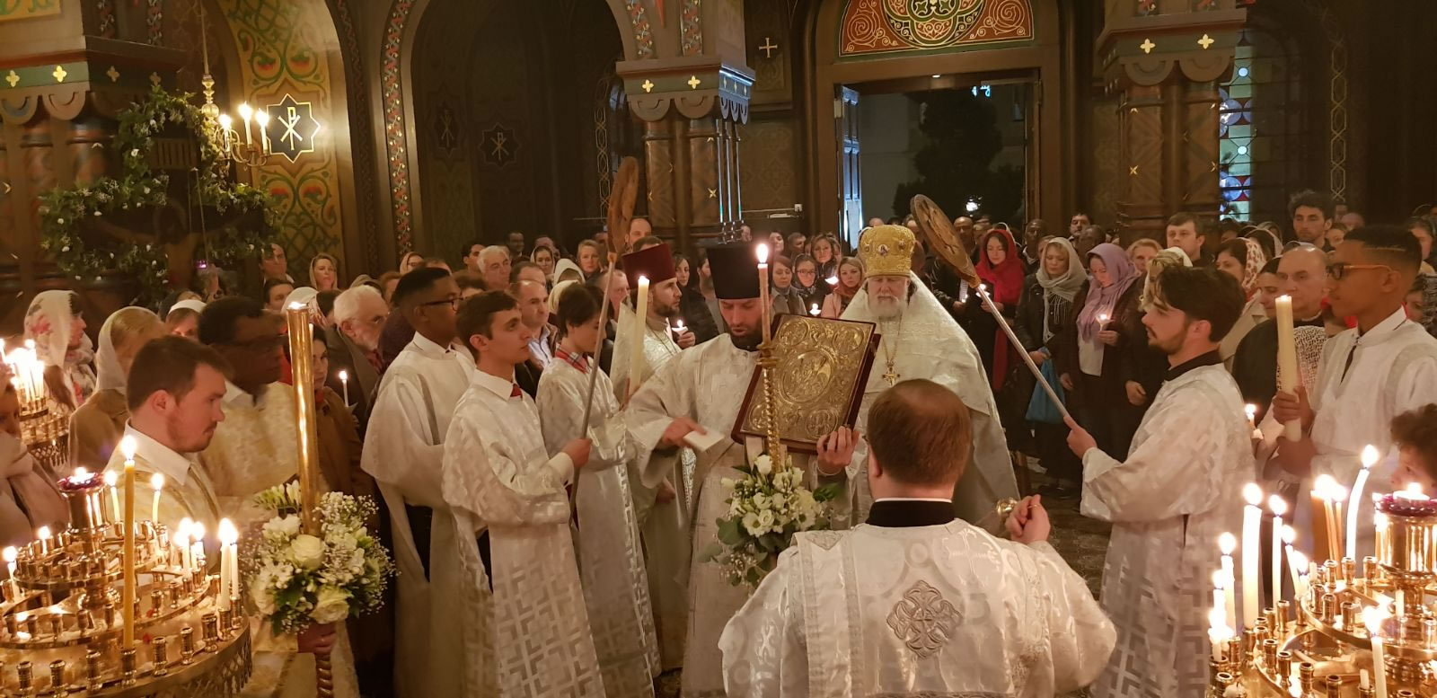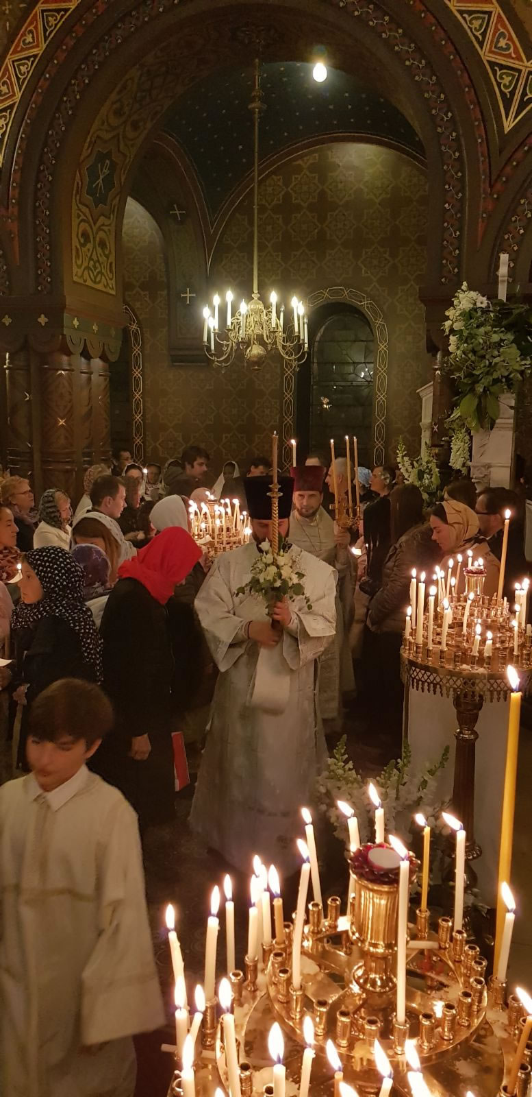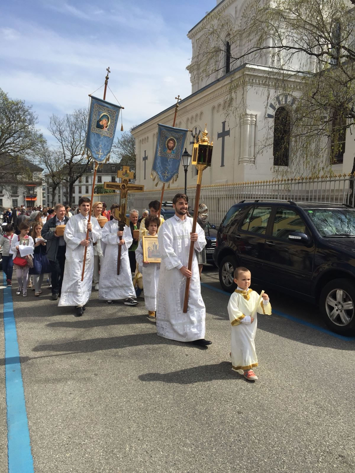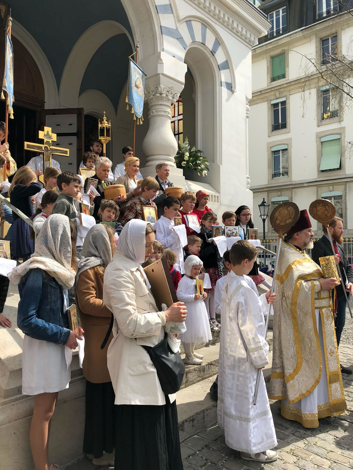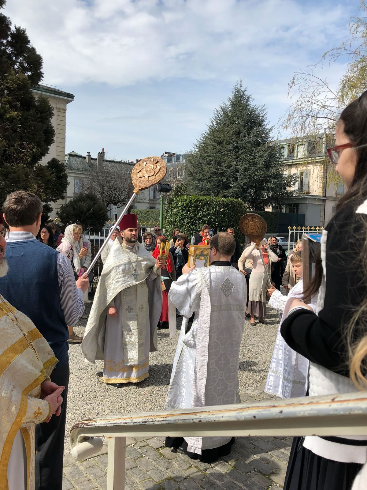 On Great Saturday, April 7, 2018, midnight office at Elevation of the Holy Cross Cathedral in Geneva, Switzerland, began at 11:30 pm. A procession of the cross under the peal of bells exclaimed to the city the Risen Christ the Savior. Divine services, including Liturgy, were led by Protopriest Pavel Tsvetkoff along with Protopriest Emilian Pochinok and the cathedral’s deacons. The joyous declaration “Christ is Risen” was made in over ten languages to the multi-national cathedral parish. The cathedral choir sang artfully under the direction of Larisa Popovich and Mathew Malinin. After Divine Liturgy, the Paschal epistle of His Holiness Patriarch Kirill of Moscow and All Russia was read.