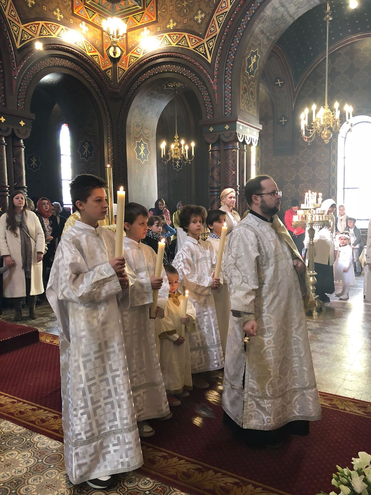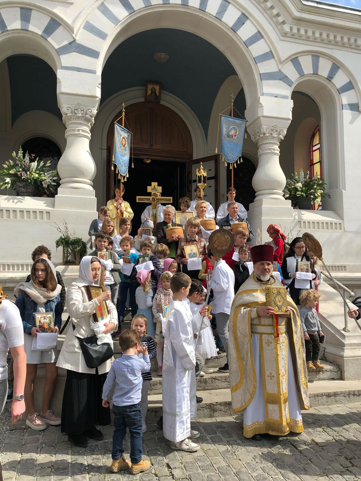 By tradition, on the second day of Pascha, the cathedral hosts a large gathering of children for Divine Liturgy, where they partake of the Holy Gifts and participate in a children’s procession of the cross that follows. Many of the young parishioners are active students of the cathedral’s Sunday school and parish life. Fr Emilian gave each youngster a gift of sweets and his blessing.