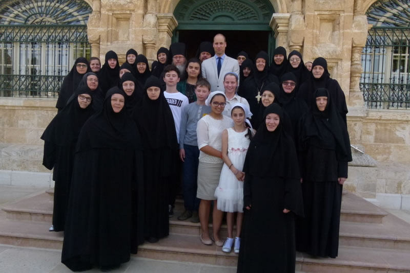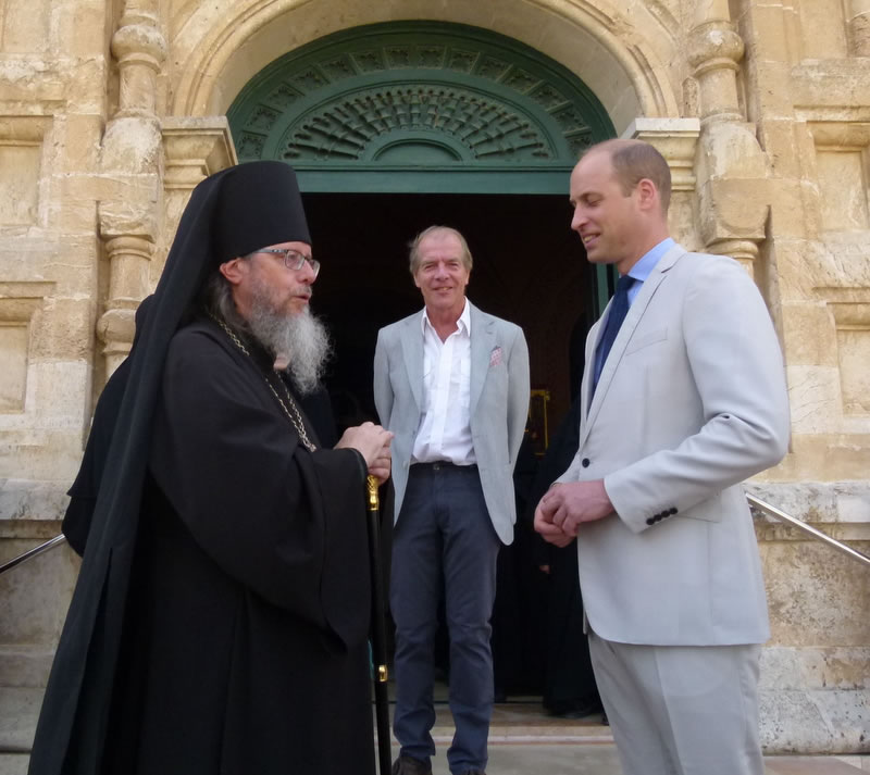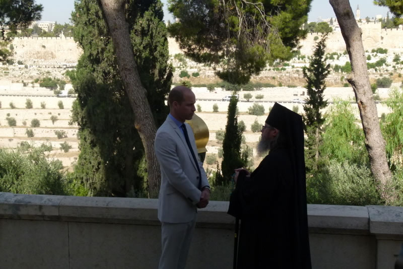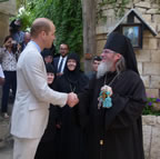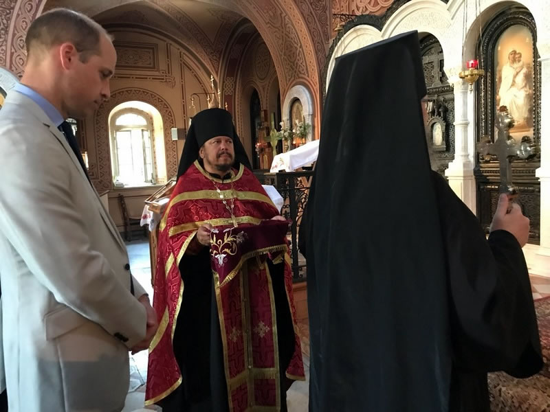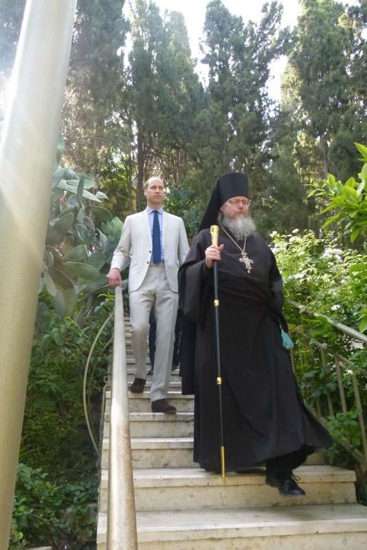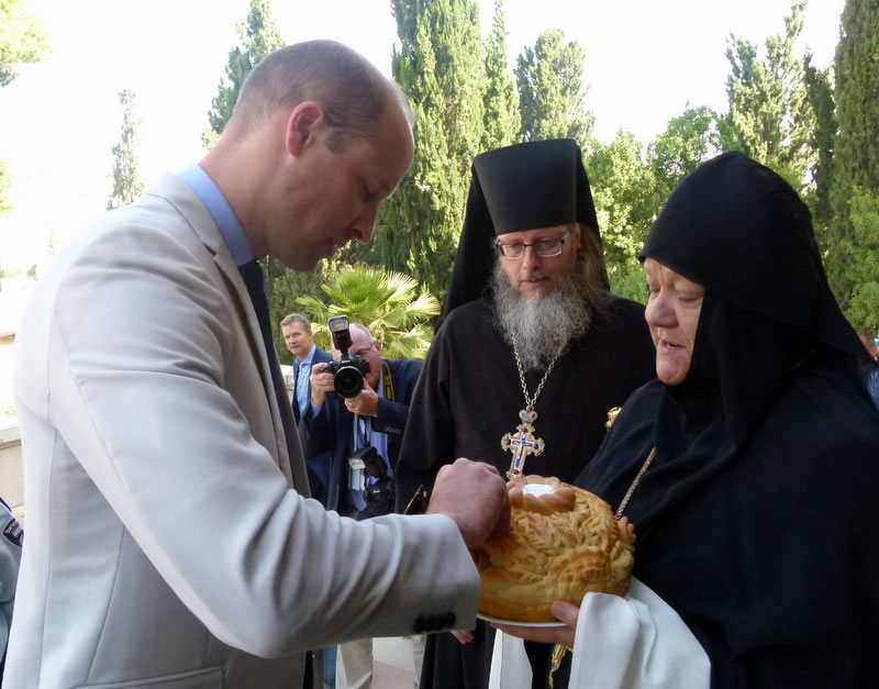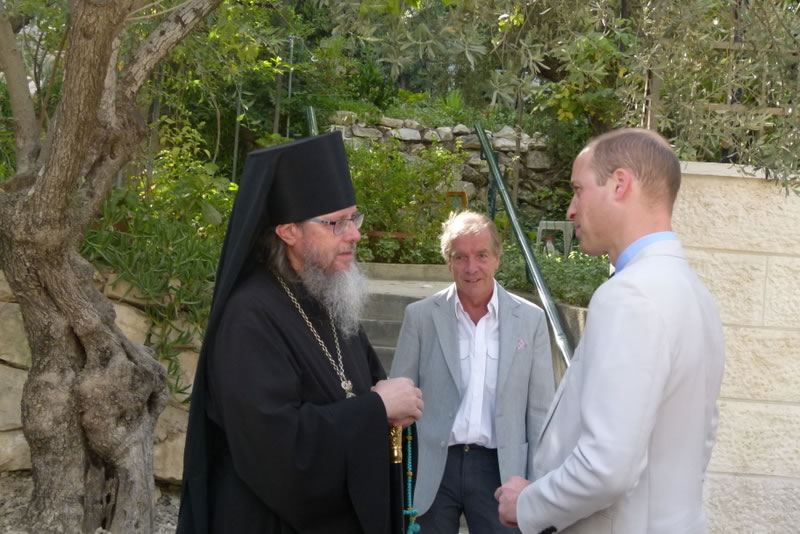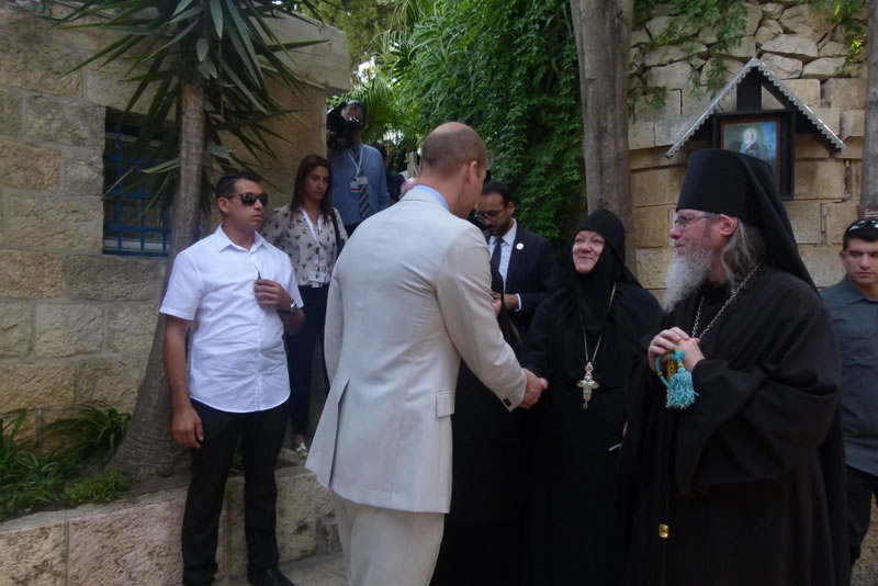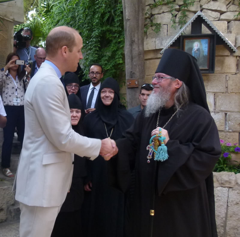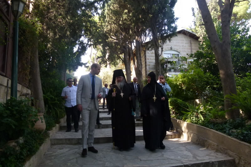 His Royal Highness was greeted at the gate of the monastery by Archimandrite Roman (Krassovsky), Chief of the Russian Ecclesiastical Mission in Jerusalem, who escorted Prince William into the church. On the terrace before the church, Fr Roman pointed out the holy places of the old city of Jerusalem seen from there. Abbess Elisabeth (Smelic) greeted him with the traditional bread and salt.