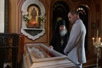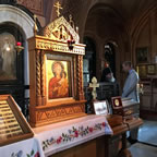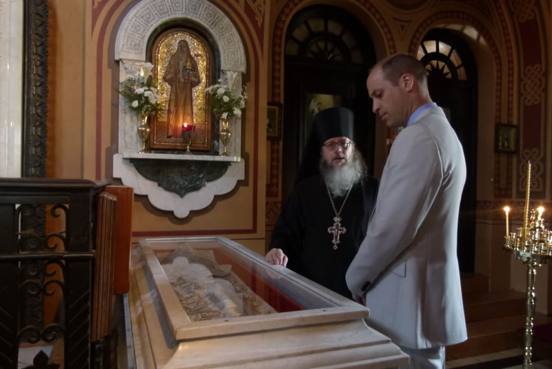 Prince William laid flowers on the reliquary and lit a candle. Fr Roman explained the relationship between St Elisabeth and the church, the death of her husband, of her becoming a nun and opening the Convent of SS Martha and Mary in Moscow, where there was an orphanage and hospital. He also explained how she, along with her august sister Empress Alexandra with her daughters, were operating-theater nurses during WWI. Fr Roman explained the circumstances of her death, telling the Prince that "the murder of St Elisabeth was a tragedy for the Russian people and a personal loss for his family, but now we have a fervent intercessor before the throne of the Lord."